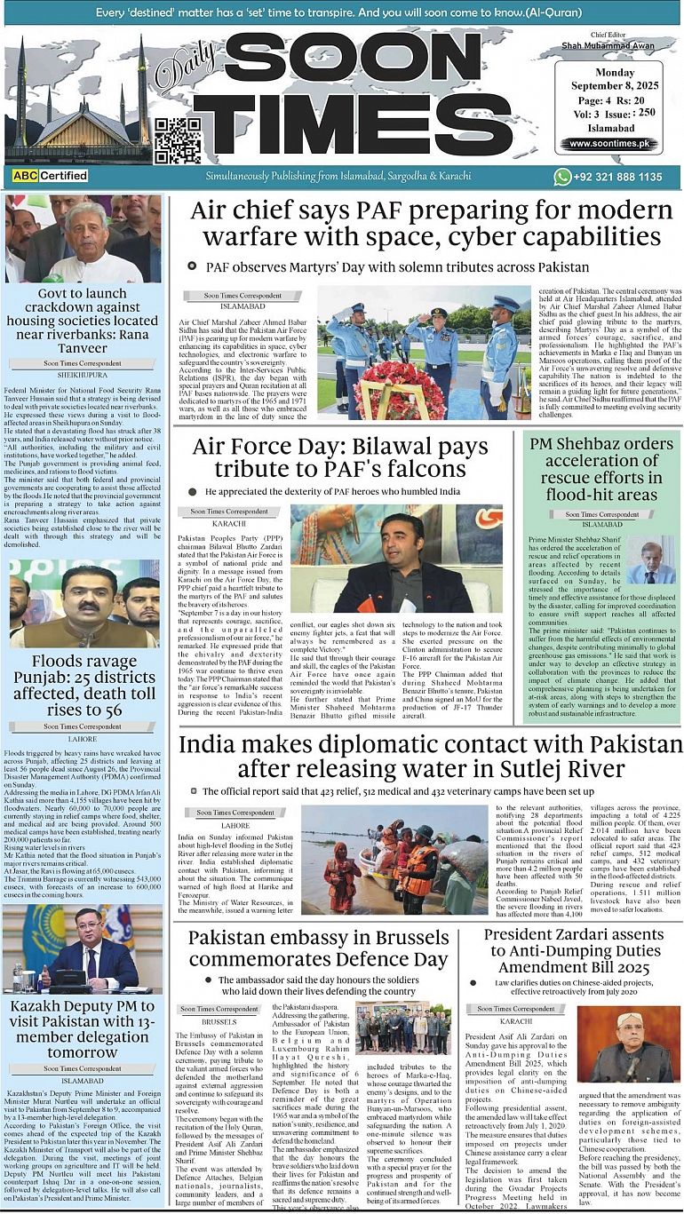 Daily Soon Times September 08, 2025 Daily Soon Times today's ePaper leading English national newspaper from Islamabad, Sargodha, Karachi, Pakistan << First << 1 >> Last >> Page 1Page 2Page 3Page 4 × Daily Soon Times 1.234 1.234 1.