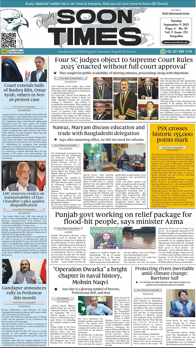 Daily Soon Times today's ePaper leading English national newspaper from Islamabad, Sargodha, Karachi, Pakistan