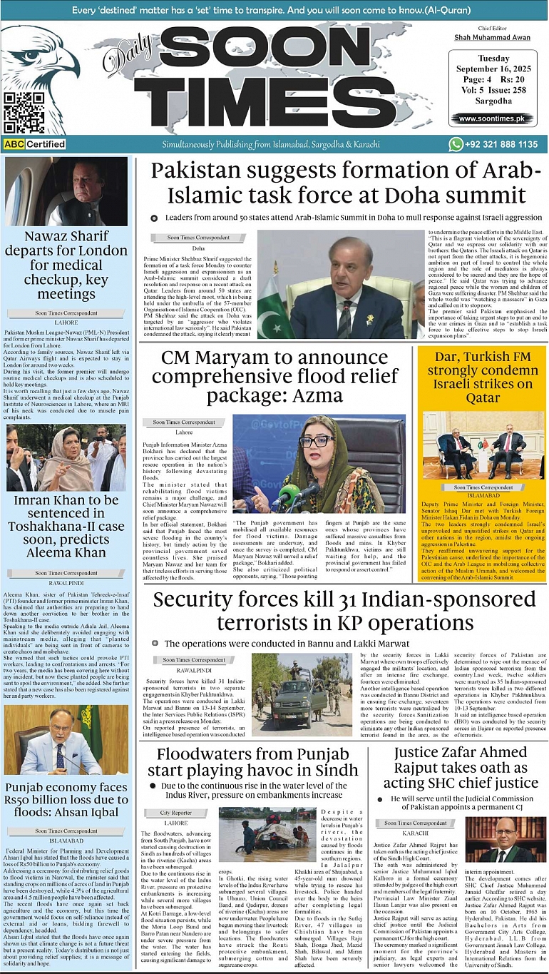 Daily Soon Times September 16, 2025 Daily Soon Times today's ePaper leading English national newspaper from Islamabad, Sargodha, Karachi, Pakistan << First << 1 >> Last >> Page 1Page 2Page 3Page 4 × Daily Soon Times 1234 1234 1