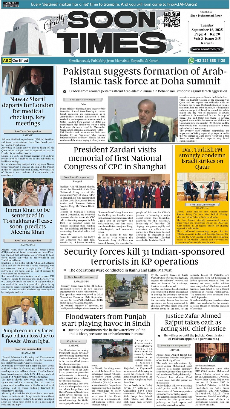 Daily Soon Times today's ePaper leading English national newspaper from Islamabad, Sargodha, Karachi, Pakistan
