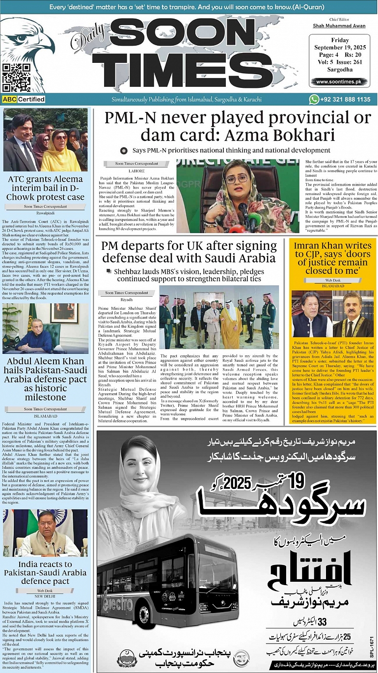 Daily Soon Times today's ePaper leading English national newspaper from Islamabad, Sargodha, Karachi, Pakistan