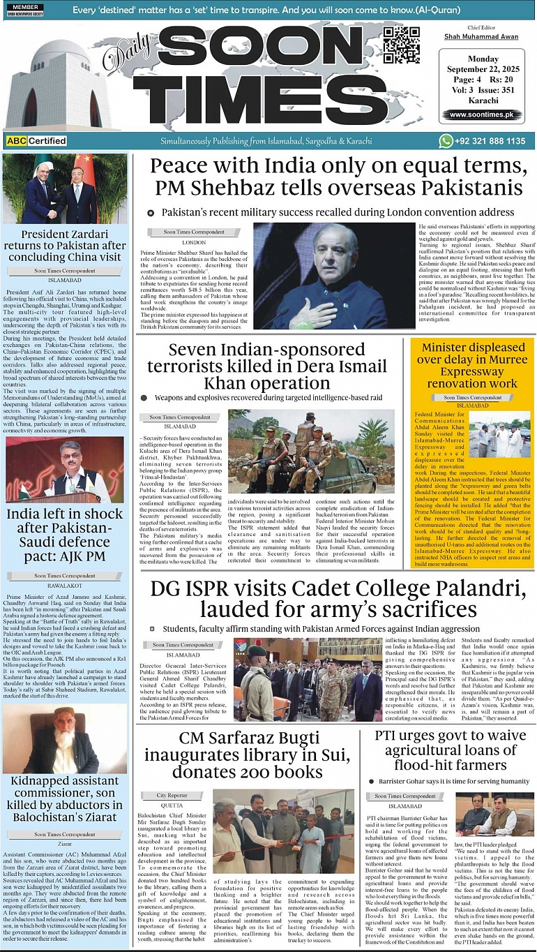 Daily Soon Times today's ePaper leading English national newspaper from Islamabad, Sargodha, Karachi, Pakistan