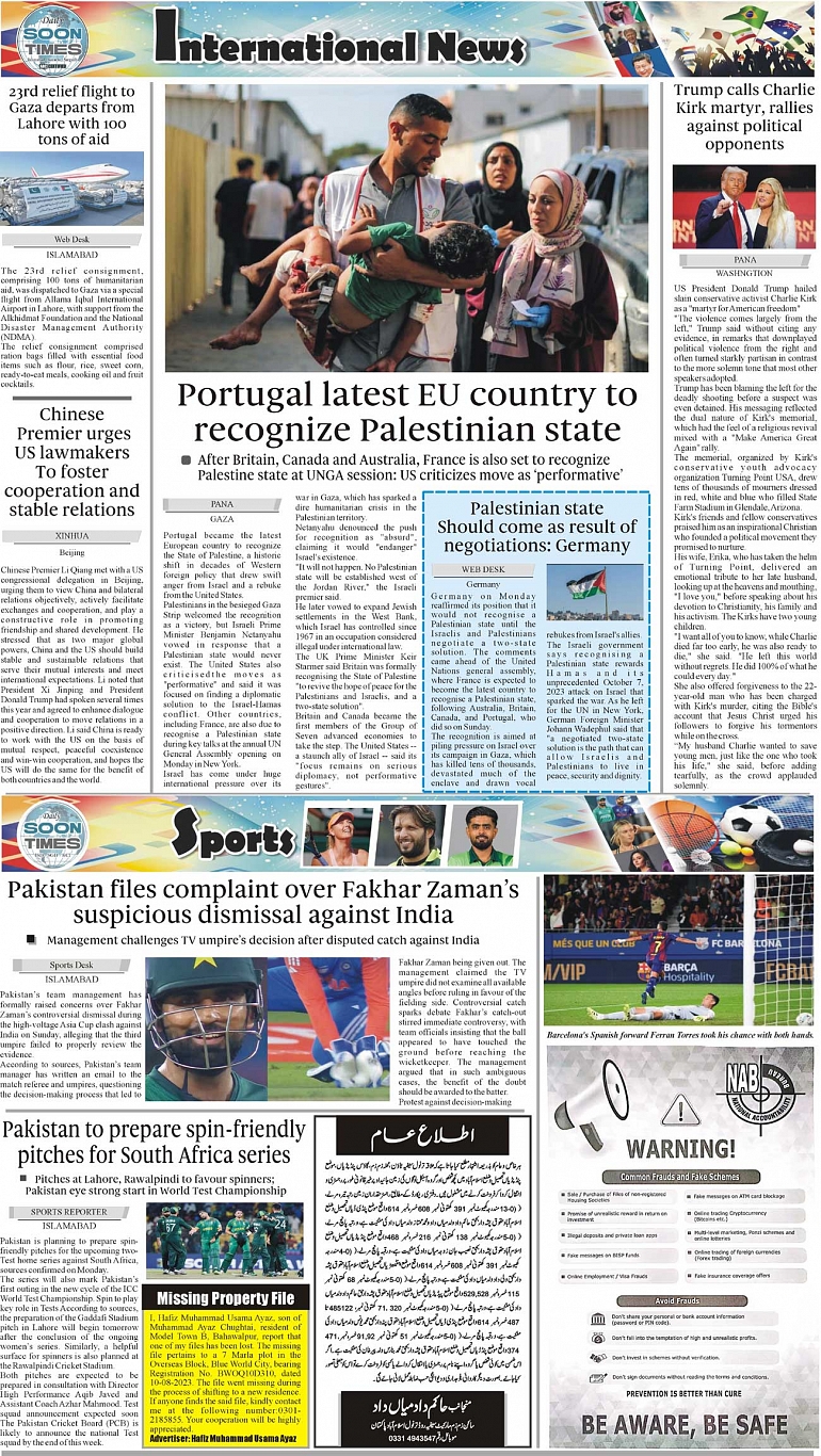 Daily Soon Times Page: 4 September 23, 2025 Daily Soon Times today's ePaper leading English national newspaper from Islamabad, Sargodha, Karachi, Pakistan << First << 4 >> Last >> Page 1Page 2Page 3Page 4 × Daily Soon Times 1234 1234 4