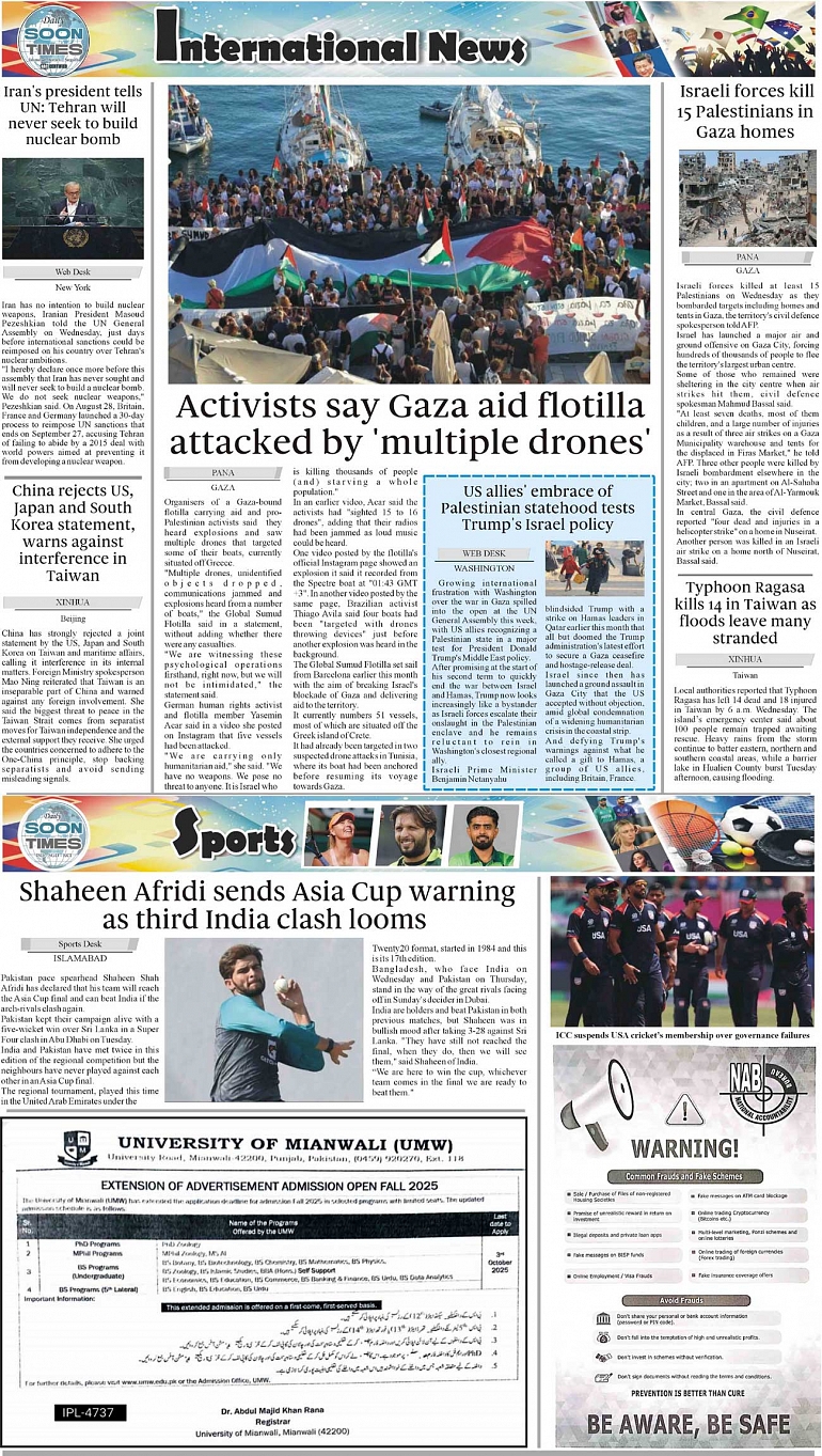 Daily Soon Times Page: 4 September 25, 2025 Daily Soon Times today's ePaper leading English national newspaper from Islamabad, Sargodha, Karachi, Pakistan << First << 4 >> Last >> Page 1Page 2Page 3Page 4 × Daily Soon Times 1234s 1234s 4s