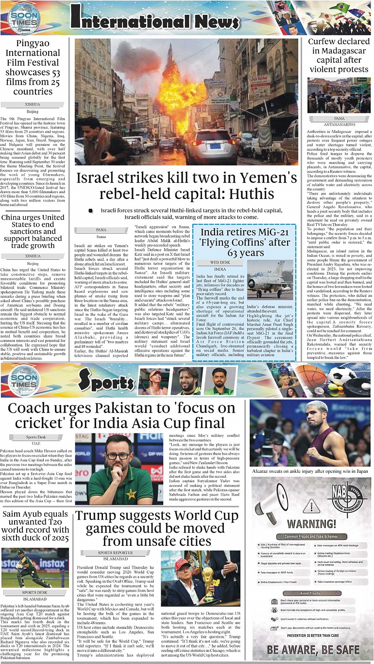 Daily Soon Times Page: 4 September 27, 2025 Daily Soon Times today's ePaper leading English national newspaper from Islamabad, Sargodha, Karachi, Pakistan << First << 4 >> Last >> Page 1Page 2Page 3Page 4 × Daily Soon Times 1.234 1.234 4