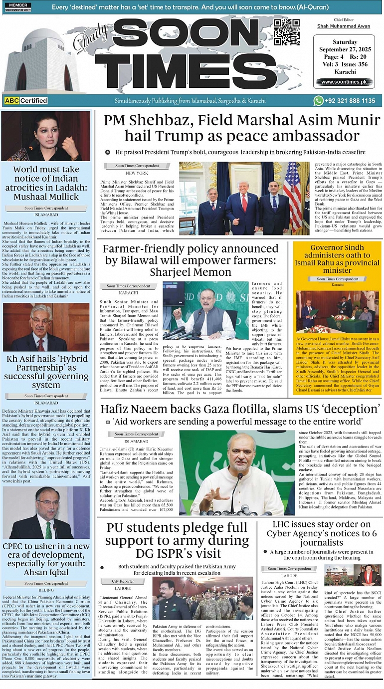 Daily Soon Times today's ePaper leading English national newspaper from Islamabad, Sargodha, Karachi, Pakistan