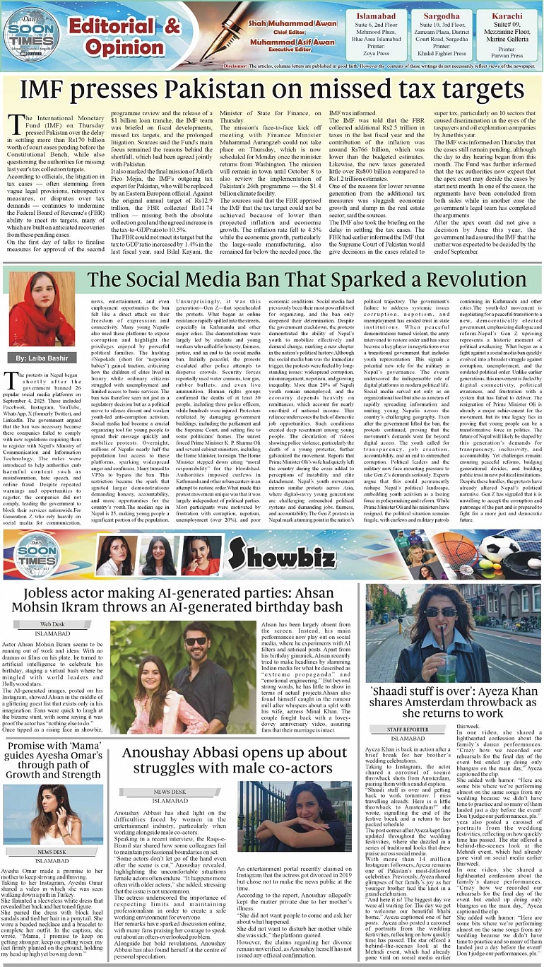 Daily Soon Times Page: 2 September 27, 2025 Daily Soon Times today's ePaper leading English national newspaper from Islamabad, Sargodha, Karachi, Pakistan << First << 2 >> Last >> Page 1Page 2Page 3Page 4 × Daily Soon Times 1k23k4 1k23k4 2