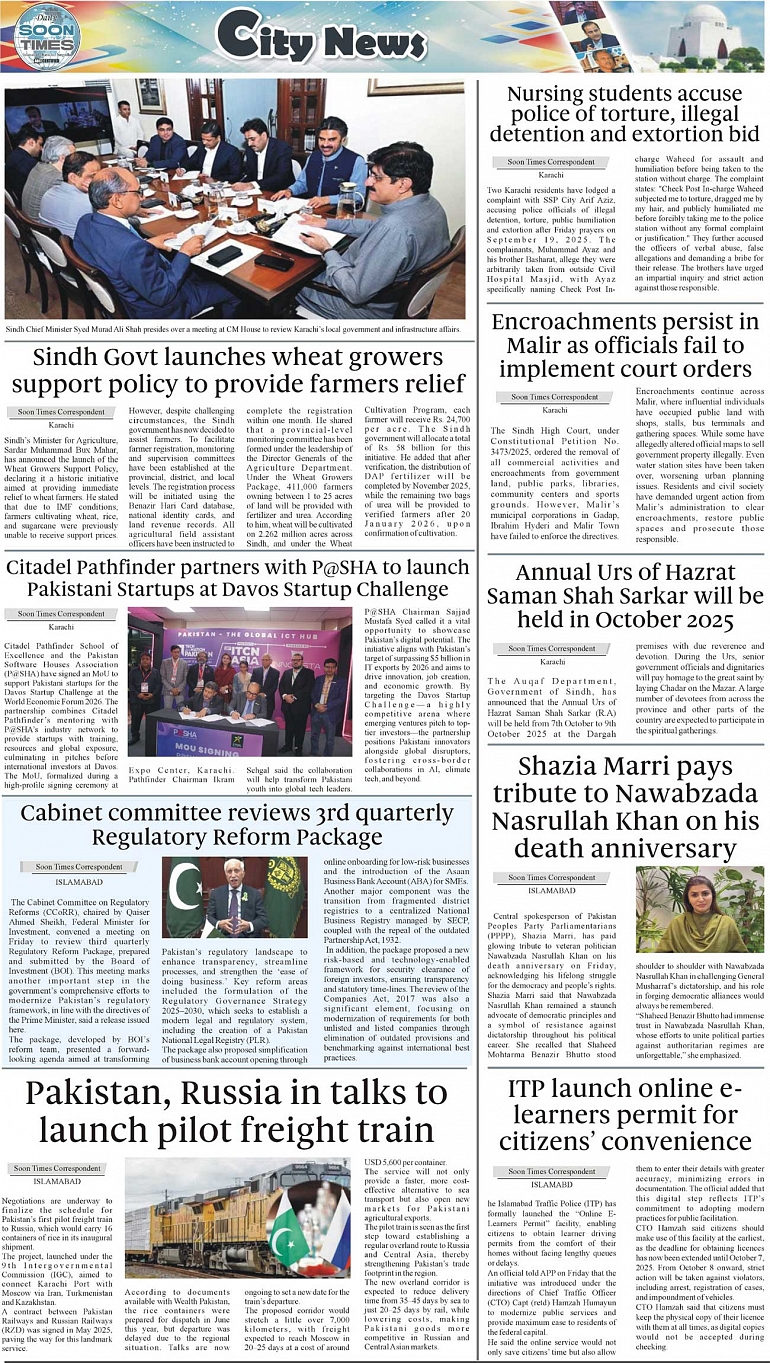 Daily Soon Times Page: 3 September 27, 2025 Daily Soon Times today's ePaper leading English national newspaper from Islamabad, Sargodha, Karachi, Pakistan << First << 3 >> Last >> Page 1Page 2Page 3Page 4 × Daily Soon Times 1k23k4 1k23k4 3k