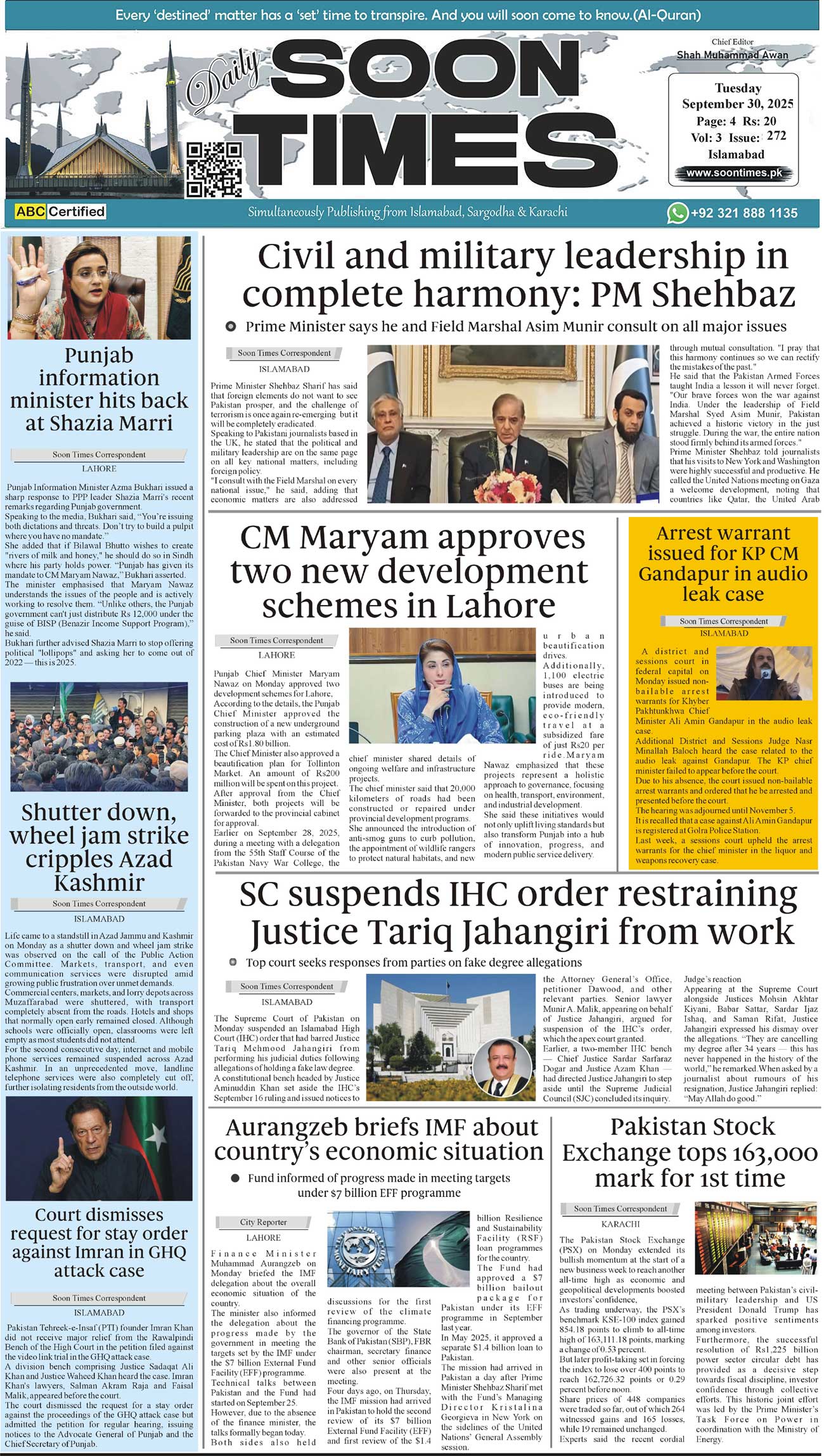 Daily Soon Times September 30, 2025 Daily Soon Times today's ePaper leading English national newspaper from Islamabad, Sargodha, Karachi, Pakistan << First << 1 >> Last >> Page 1Page 2Page 3Page 4 × Daily Soon Times 1234 1234 1