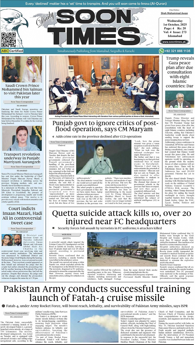 Daily Soon Times today's ePaper leading English national newspaper from Islamabad, Sargodha, Karachi, Pakistan