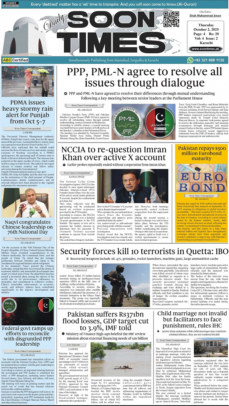 Daily Soon Times today's ePaper leading English national newspaper from Islamabad, Sargodha, Karachi, Pakistan