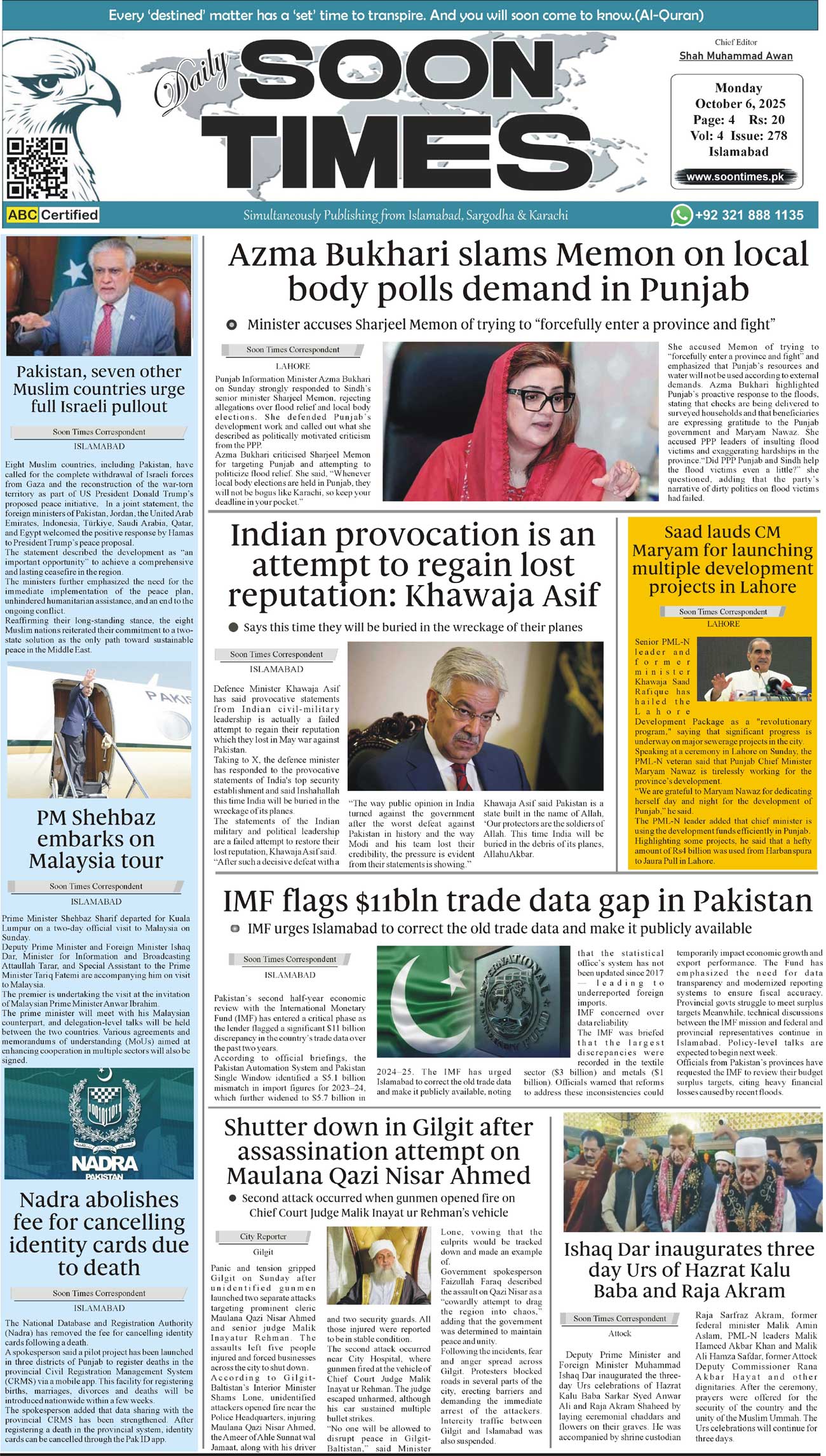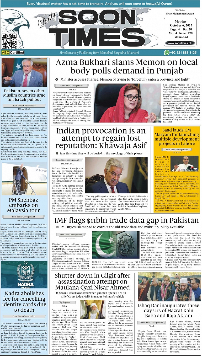 Daily Soon Times October 06, 2025 Daily Soon Times today's ePaper leading English national newspaper from Islamabad, Sargodha, Karachi, Pakistan << First << 1 >> Last >> Page 1Page 2Page 3Page 4 × Daily Soon Times 1234 1234 1