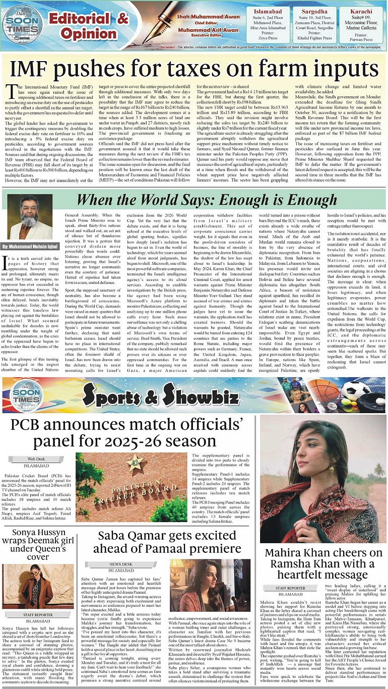 Daily Soon Times Page: 2 October 08, 2025 Daily Soon Times today's ePaper leading English national newspaper from Islamabad, Sargodha, Karachi, Pakistan << First << 2 >> Last >> Page 1Page 2Page 3Page 4 × Daily Soon Times 1.234 1.234 2