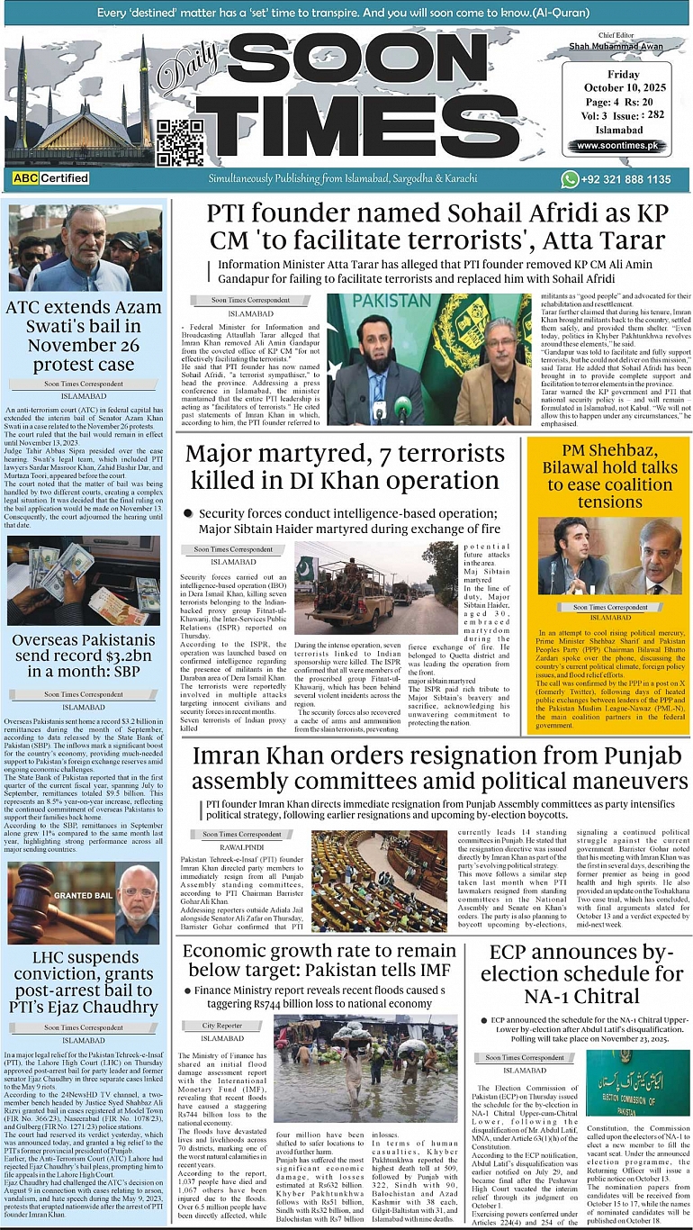 Daily Soon Times October 10, 2025 Daily Soon Times today's ePaper leading English national newspaper from Islamabad, Sargodha, Karachi, Pakistan << First << 1 >> Last >> Page 1Page 2Page 3Page 4 × Daily Soon Times 1.234s 1.234s 1.