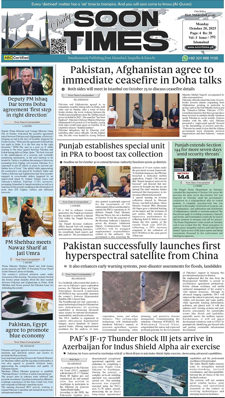 Daily Soon Times today's ePaper leading English national newspaper from Islamabad, Sargodha, Karachi, Pakistan