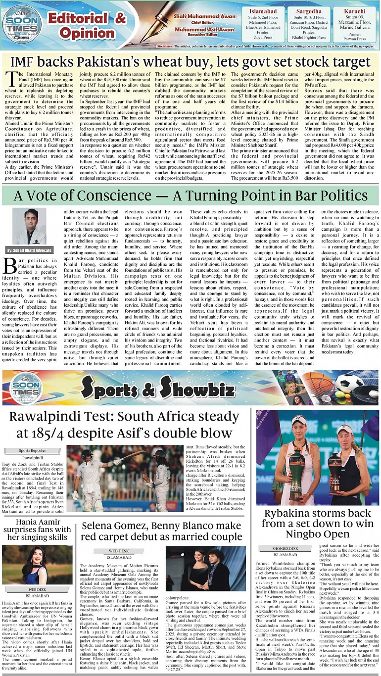 Daily Soon Times Page: 2 October 22, 2025 Daily Soon Times today's ePaper leading English national newspaper from Islamabad, Sargodha, Karachi, Pakistan << First << 2 >> Last >> Page 1Page 2Page 3Page 4 × Daily Soon Times 1234 1234 2