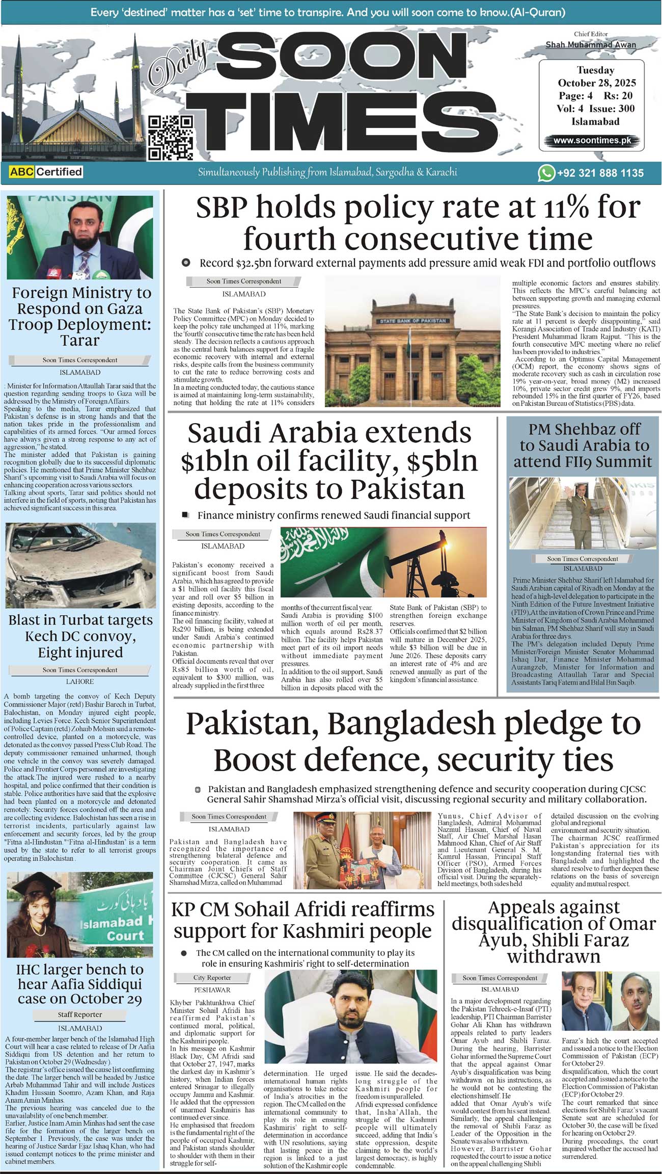 Daily Soon Times today's ePaper leading English national newspaper from Islamabad, Sargodha, Karachi, Pakistan