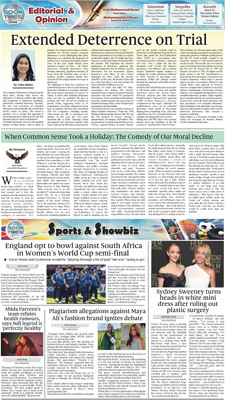 Daily Soon Times Page: 2 October 30, 2025 Daily Soon Times today's ePaper leading English national newspaper from Islamabad, Sargodha, Karachi, Pakistan << First << 2 >> Last >> Page 1Page 2Page 3Page 4 × Daily Soon Times 1234 1234 2