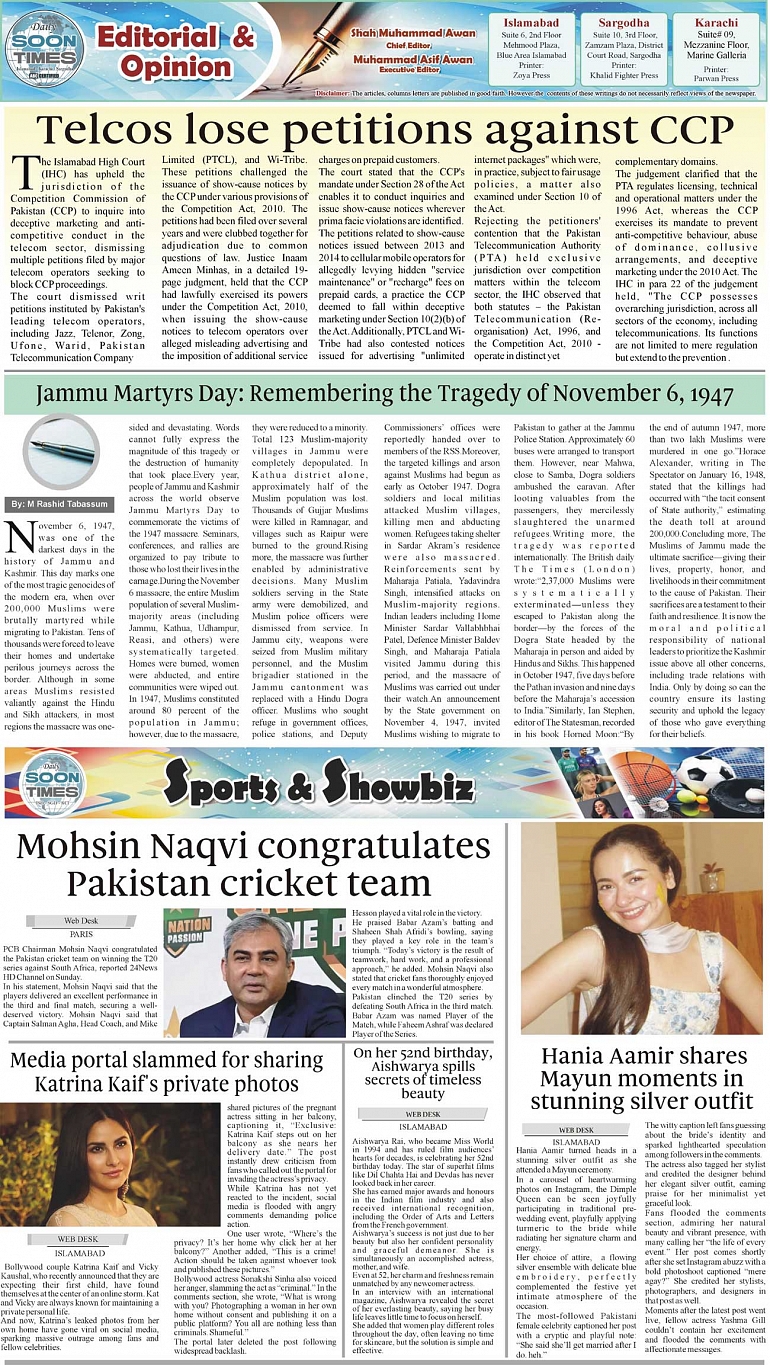 Daily Soon Times Page: 2 November 03, 2025 Daily Soon Times today's ePaper leading English national newspaper from Islamabad, Sargodha, Karachi, Pakistan << First << 2 >> Last >> Page 1Page 2Page 3Page 4 × Daily Soon Times 1.234 1.234 2