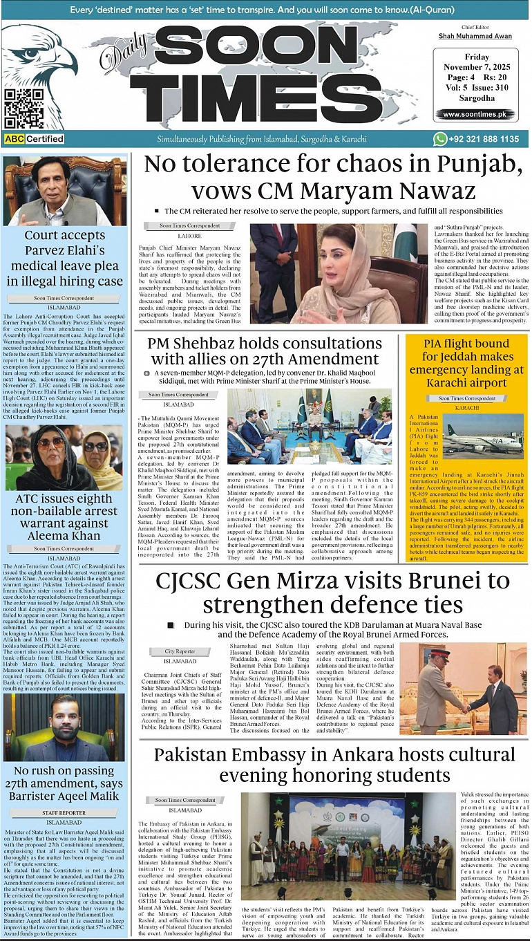 Daily Soon Times November 07, 2025 Daily Soon Times today's ePaper leading English national newspaper from Islamabad, Sargodha, Karachi, Pakistan << First << 1 >> Last >> Page 1Page 2Page 3Page 4 × Daily Soon Times 1234 1234 1