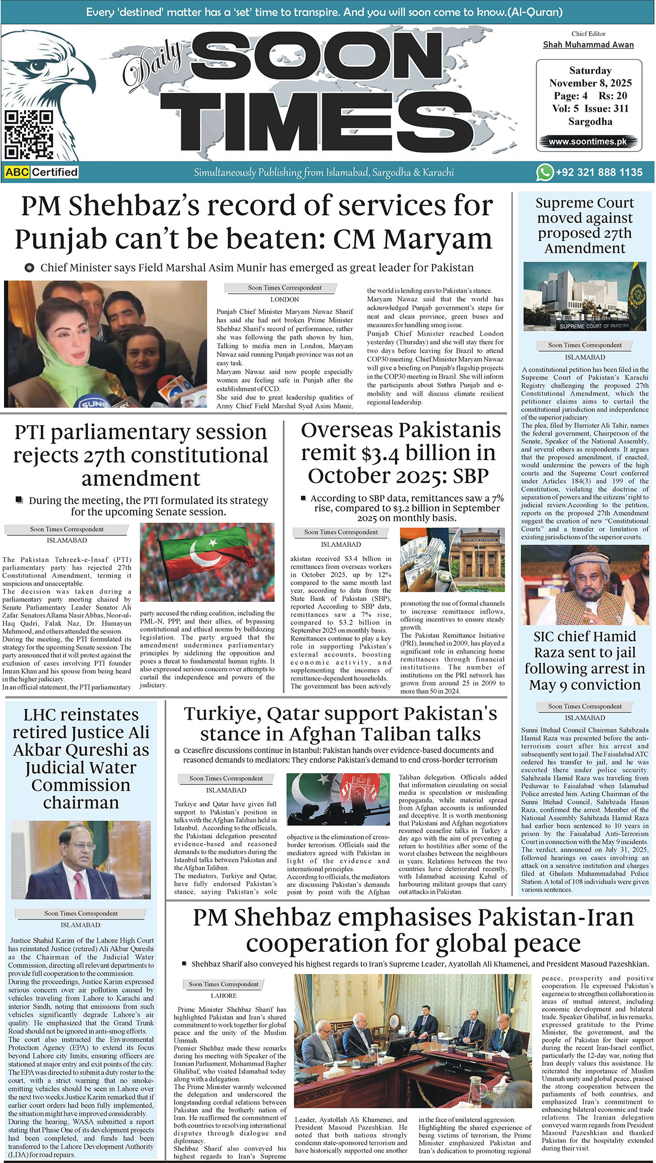 Daily Soon Times today's ePaper leading English national newspaper from Islamabad, Sargodha, Karachi, Pakistan
