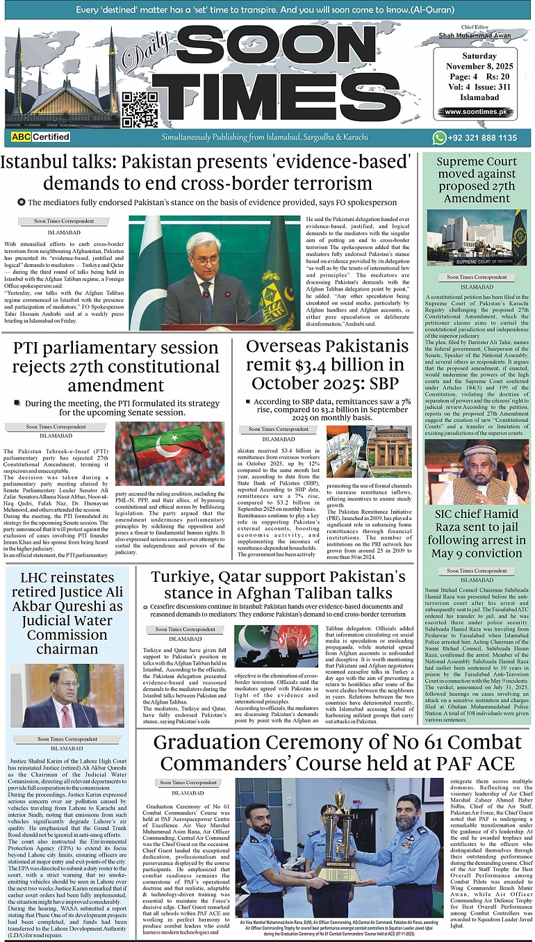 Daily Soon Times today's ePaper leading English national newspaper from Islamabad, Sargodha, Karachi, Pakistan