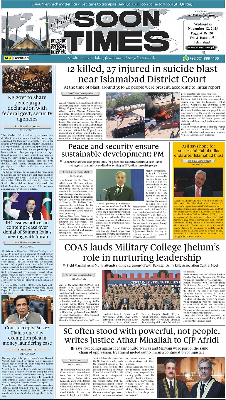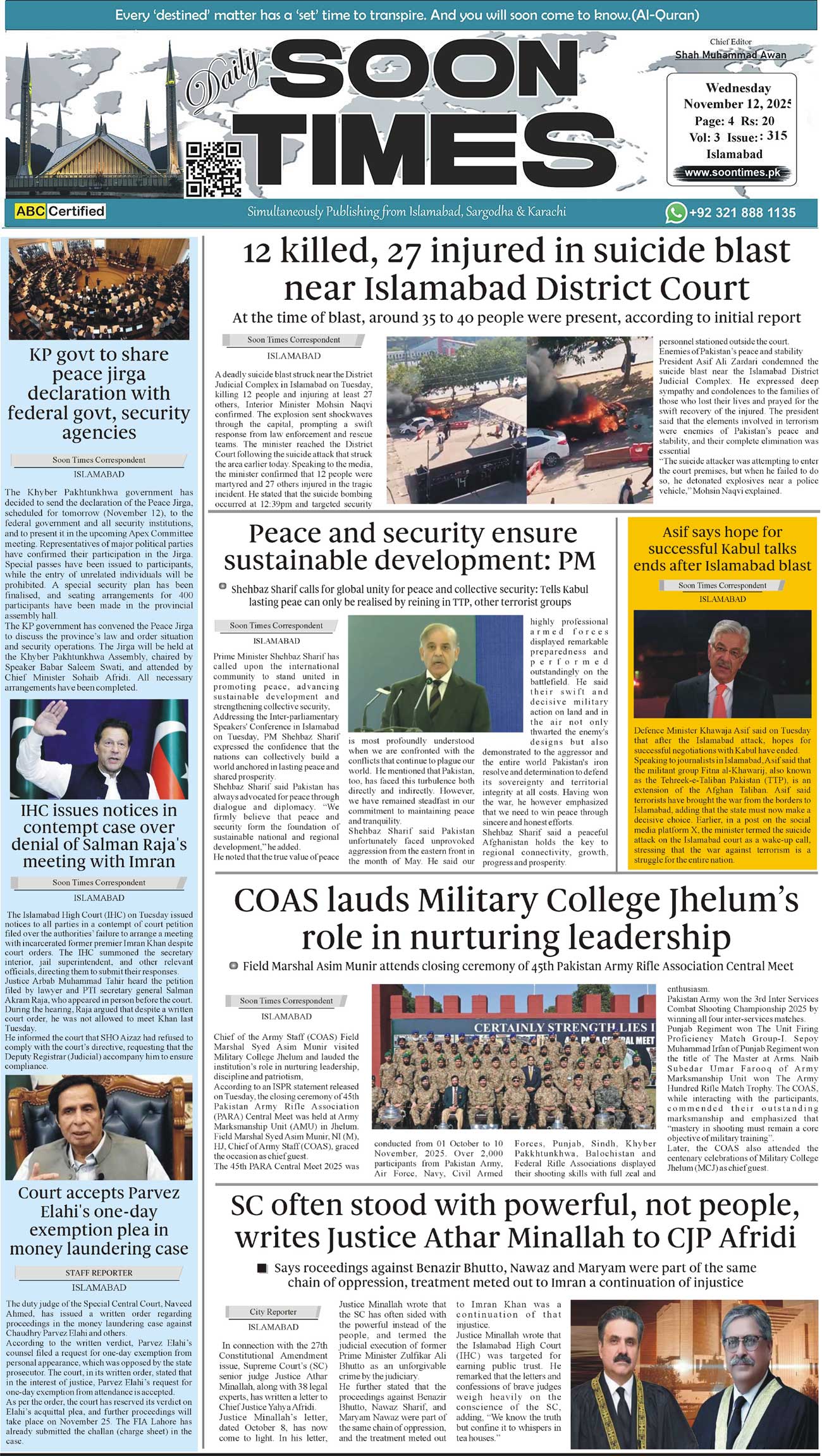 Daily Soon Times November 12, 2025 Daily Soon Times today's ePaper leading English national newspaper from Islamabad, Sargodha, Karachi, Pakistan << First << 1 >> Last >> Page 1Page 2Page 3Page 4 × Daily Soon Times 1..234 1..234 1..