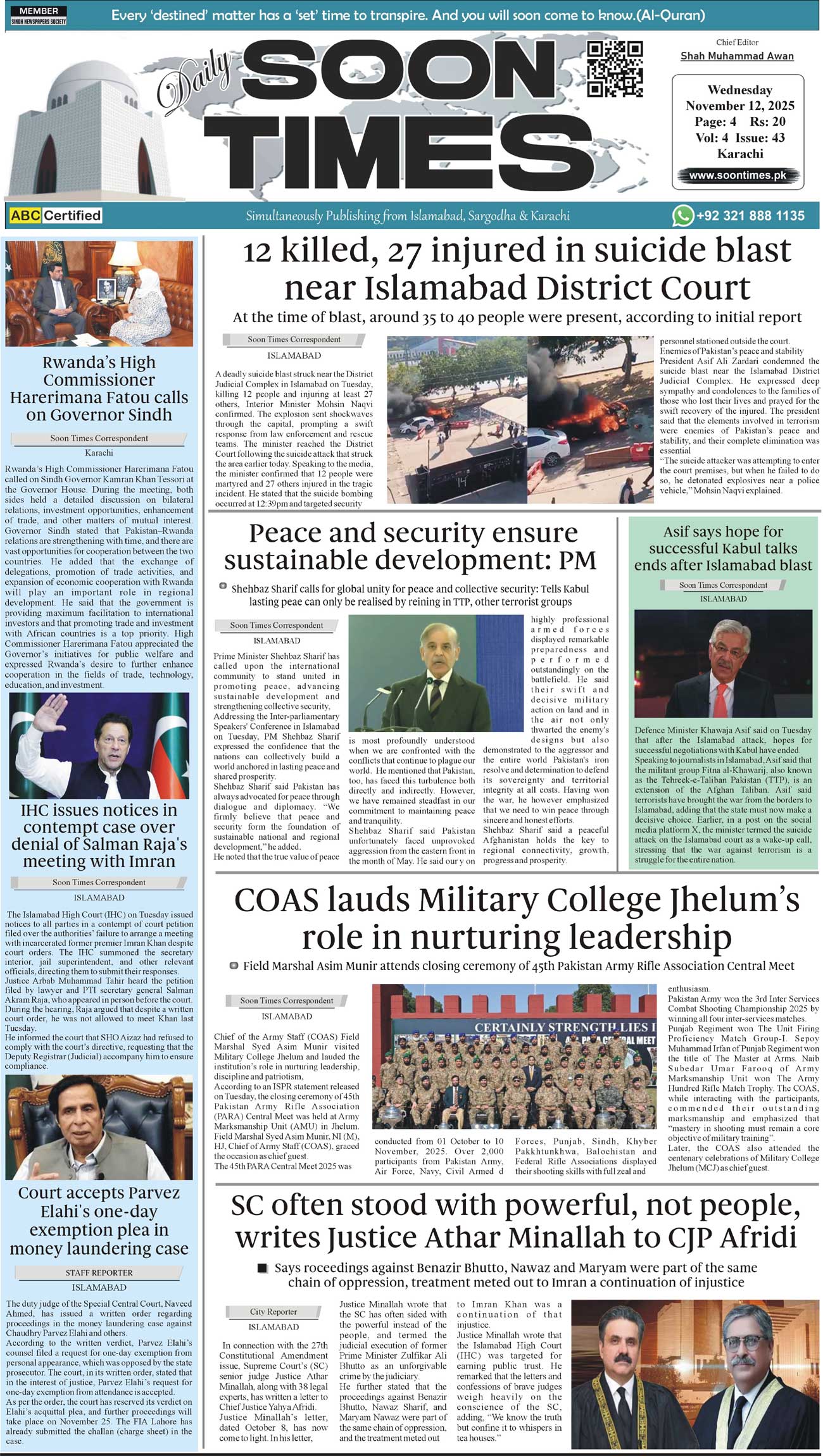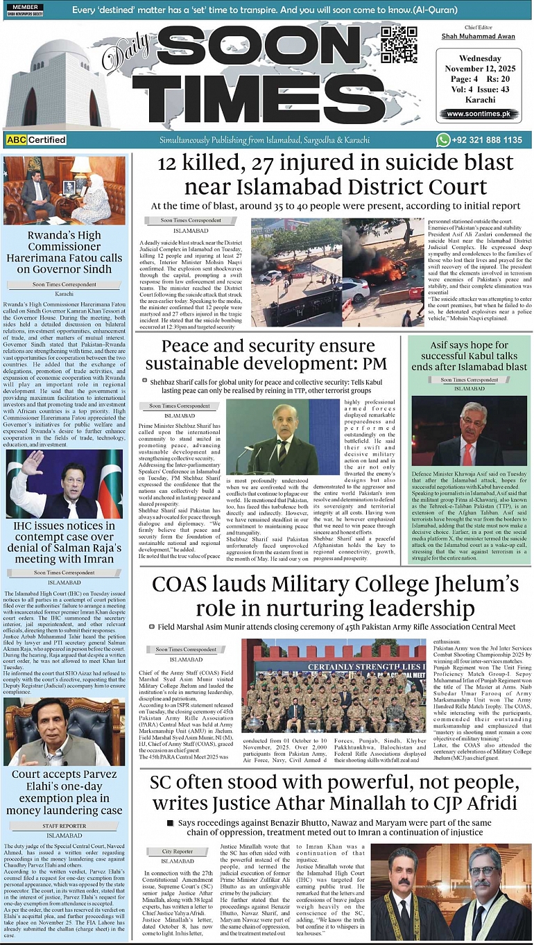 Daily Soon Times November 12, 2025 Daily Soon Times today's ePaper leading English national newspaper from Islamabad, Sargodha, Karachi, Pakistan << First << 1 >> Last >> Page 1Page 2Page 3Page 4 × Daily Soon Times 1k23k4 1k23k4 1k
