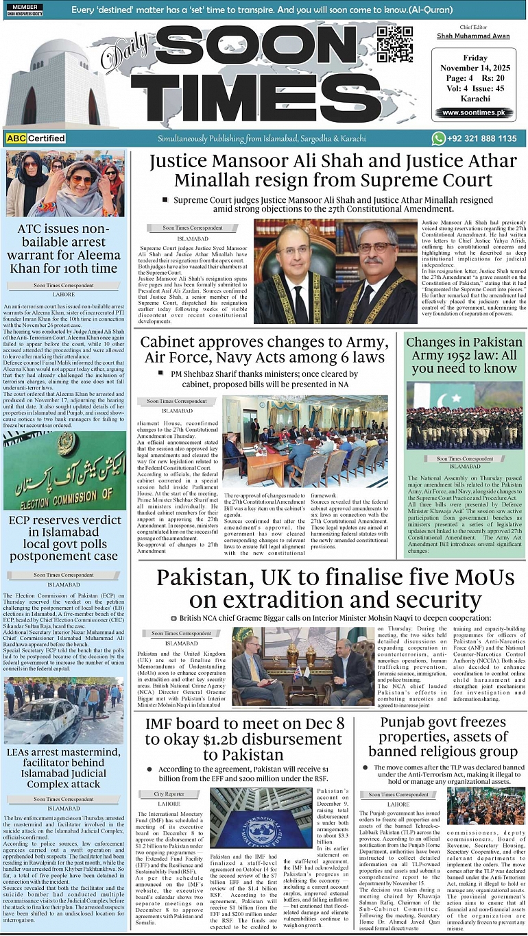 Daily Soon Times November 14, 2025 Daily Soon Times today's ePaper leading English national newspaper from Islamabad, Sargodha, Karachi, Pakistan << First << 1 >> Last >> Page 1Page 2Page 3Page 4 × Daily Soon Times 1k23k4. 1k23k4. 1k