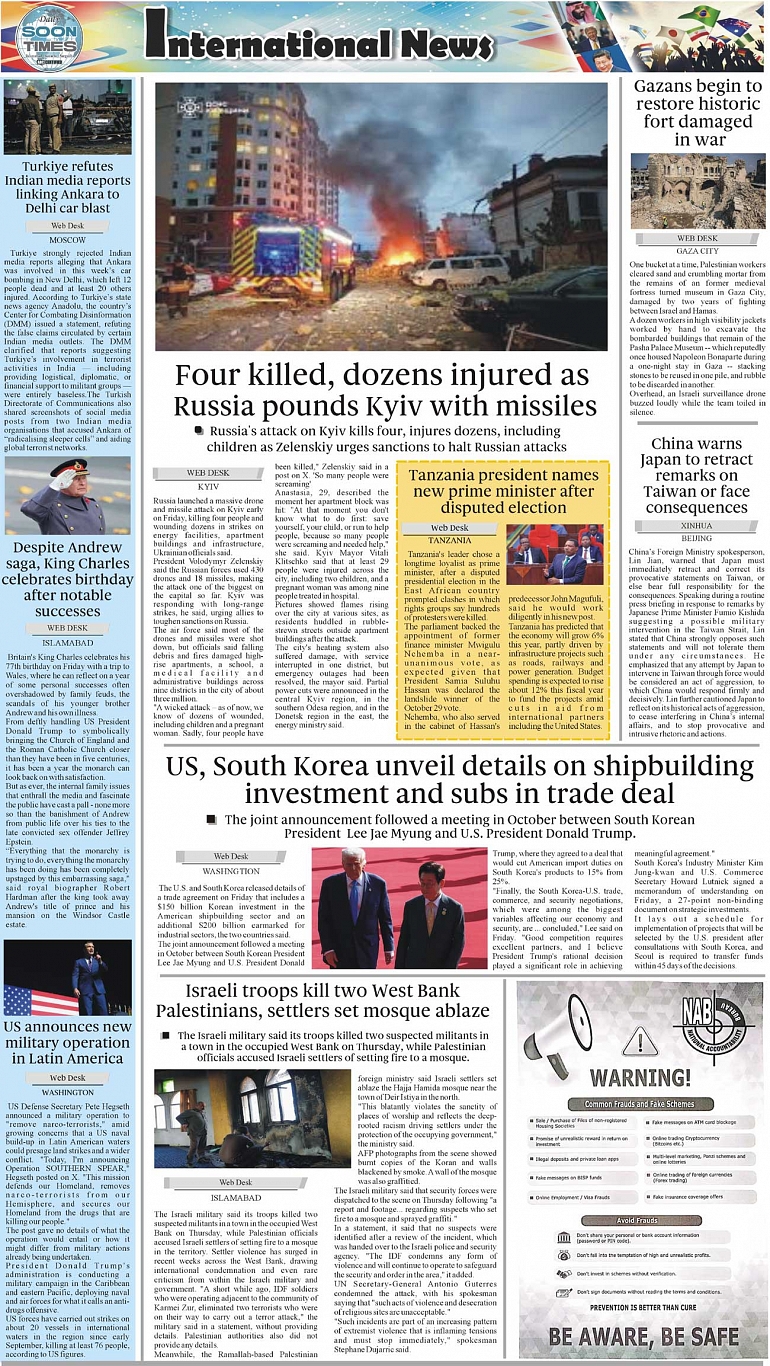 Daily Soon Times Page: 4 November 15, 2025 Daily Soon Times today's ePaper leading English national newspaper from Islamabad, Sargodha, Karachi, Pakistan << First << 4 >> Last >> Page 1Page 2Page 3Page 4 × Daily Soon Times 1k23k4 1k23k4 4