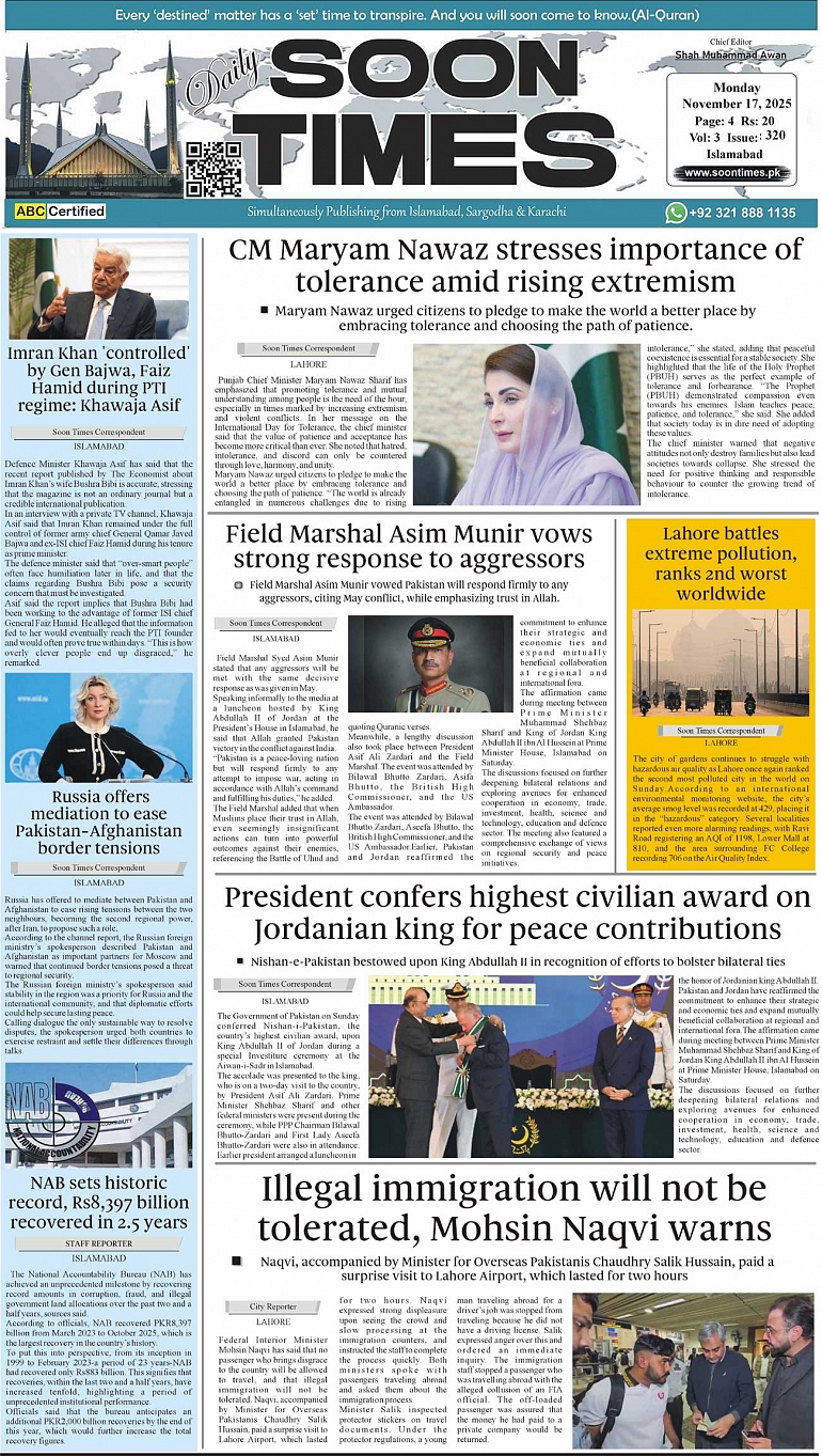 Daily Soon Times Page: 5 November 17, 2025 Daily Soon Times today's ePaper leading English national newspaper from Islamabad, Sargodha, Karachi, Pakistan << First << 5 >> Last >> Page 1Page 2Page 3Page 4Page 5Page 6Page 7Page 8 × Daily Soon Times 1k23k41.234 1k23k41.234 1.