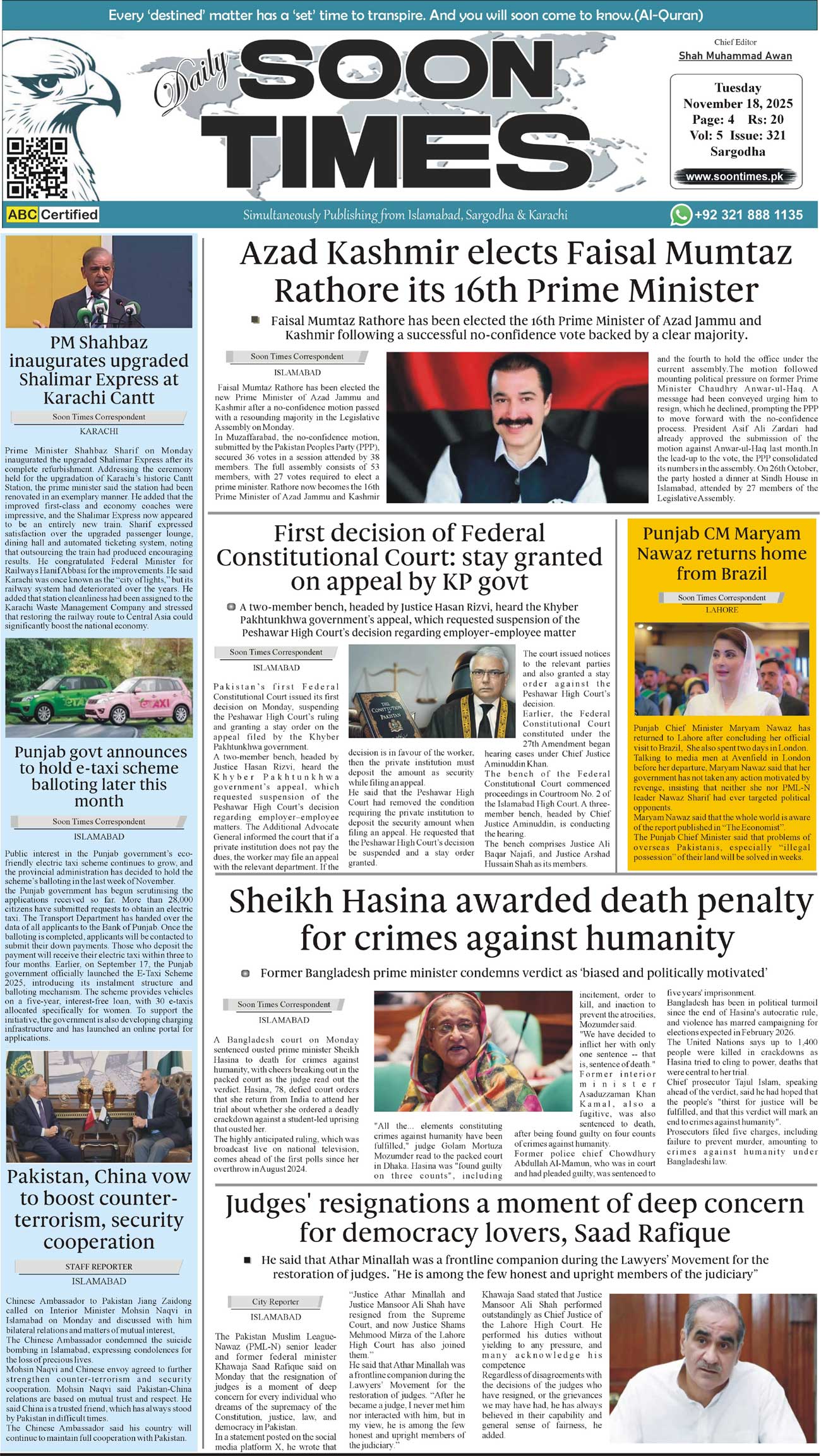 Daily Soon Times November 18, 2025 Daily Soon Times today's ePaper leading English national newspaper from Islamabad, Sargodha, Karachi, Pakistan << First << 1 >> Last >> Page 1Page 2Page 3Page 4 × Daily Soon Times 1234 1234 1