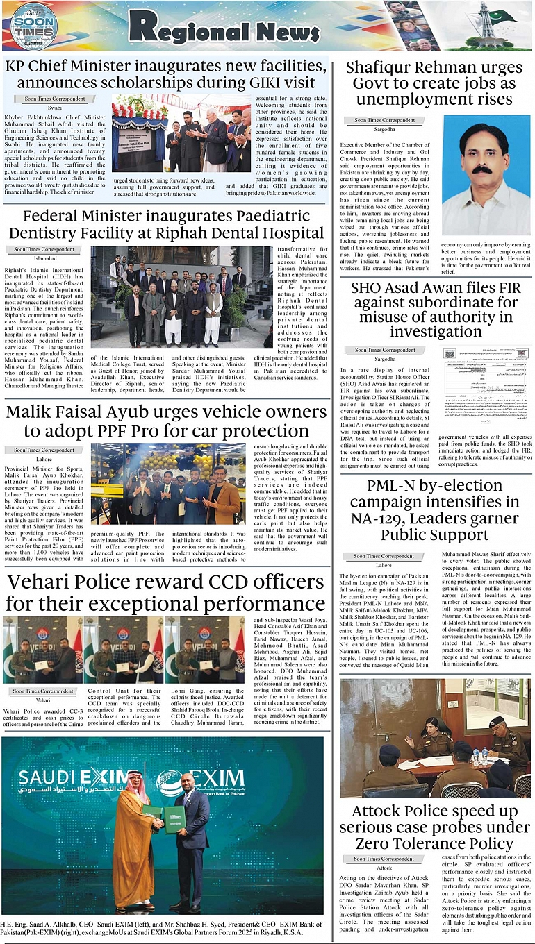 Daily Soon Times Page: 3 November 20, 2025 Daily Soon Times today's ePaper leading English national newspaper from Islamabad, Sargodha, Karachi, Pakistan << First << 3 >> Last >> Page 1Page 2Page 3Page 4 × Daily Soon Times 1234 1234 3