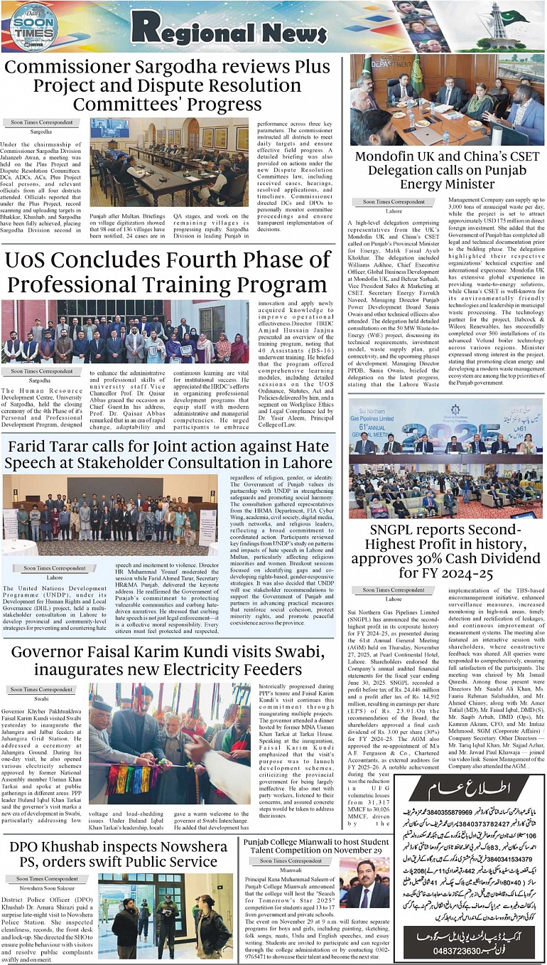 Daily Soon Times Page: 3 November 28, 2025 Daily Soon Times today's ePaper leading English national newspaper from Islamabad, Sargodha, Karachi, Pakistan << First << 3 >> Last >> Page 1Page 2Page 3Page 4 × Daily Soon Times 1234 1234 3