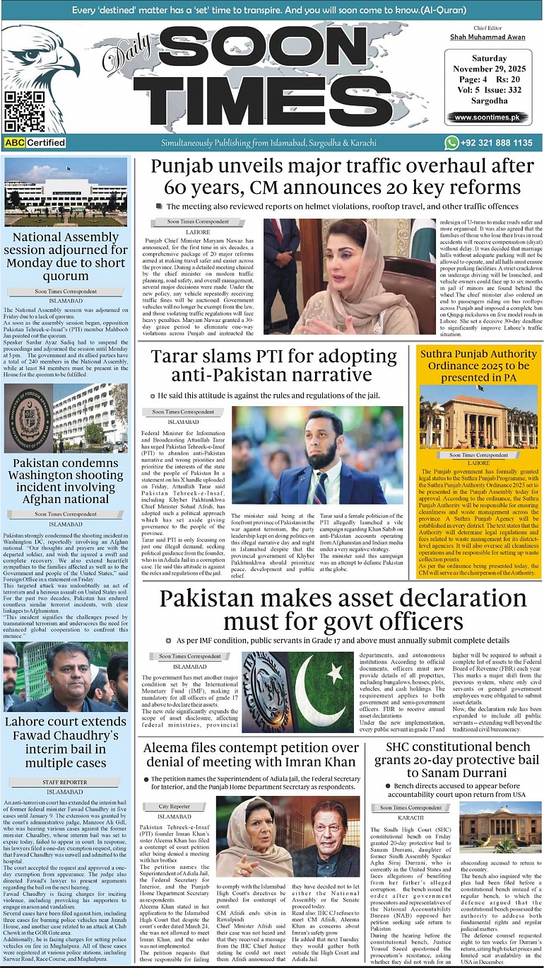 Daily Soon Times November 29, 2025 Daily Soon Times today's ePaper leading English national newspaper from Islamabad, Sargodha, Karachi, Pakistan << First << 1 >> Last >> Page 1Page 2Page 3Page 4 × Daily Soon Times 1234 1234 1