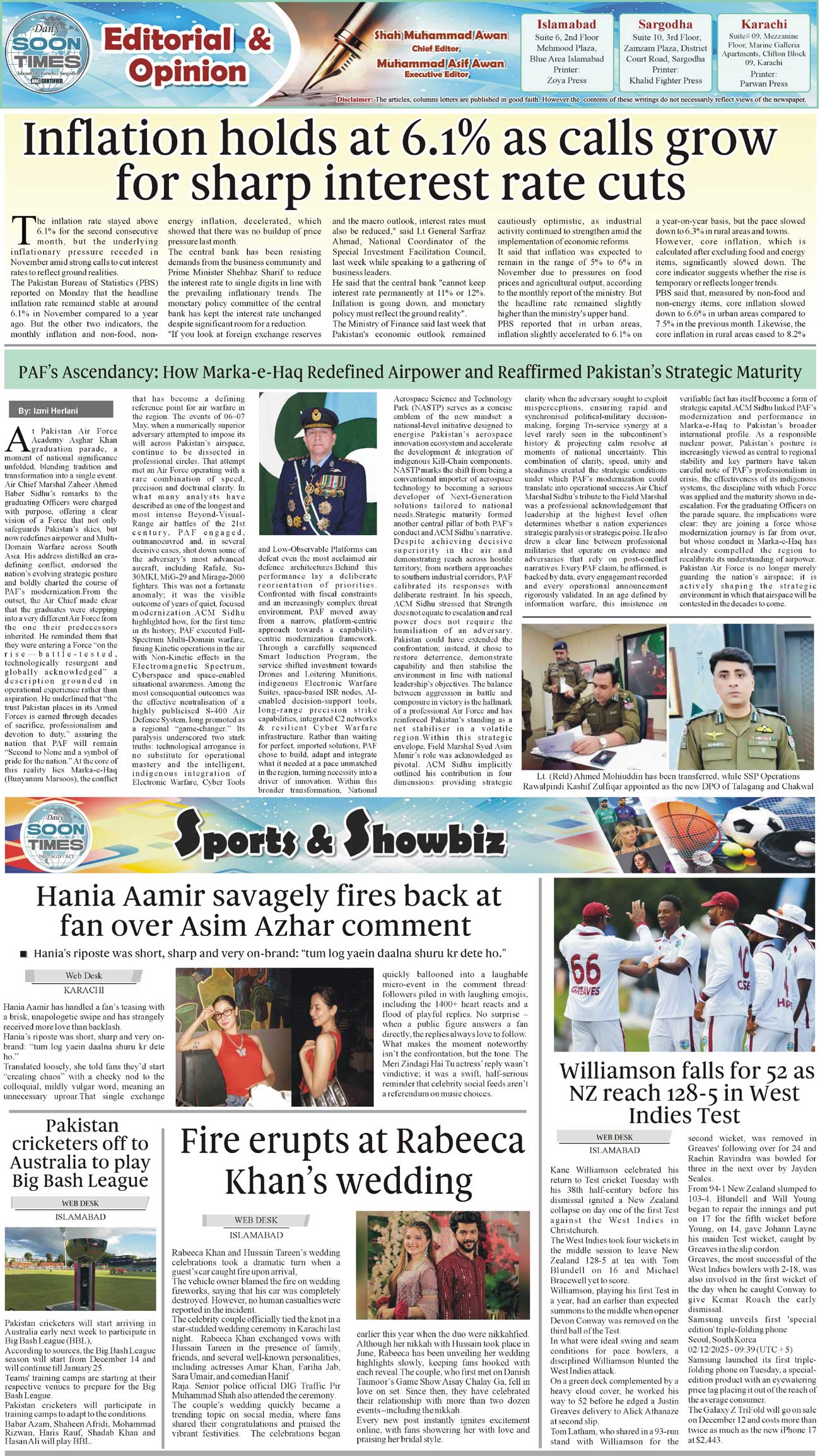 Daily Soon Times Page: 2 December 03, 2025 Daily Soon Times today's ePaper leading English national newspaper from Islamabad, Sargodha, Karachi, Pakistan << First << 2 >> Last >> Page 1Page 2Page 3Page 4 × Daily Soon Times 1.234 1.234 2