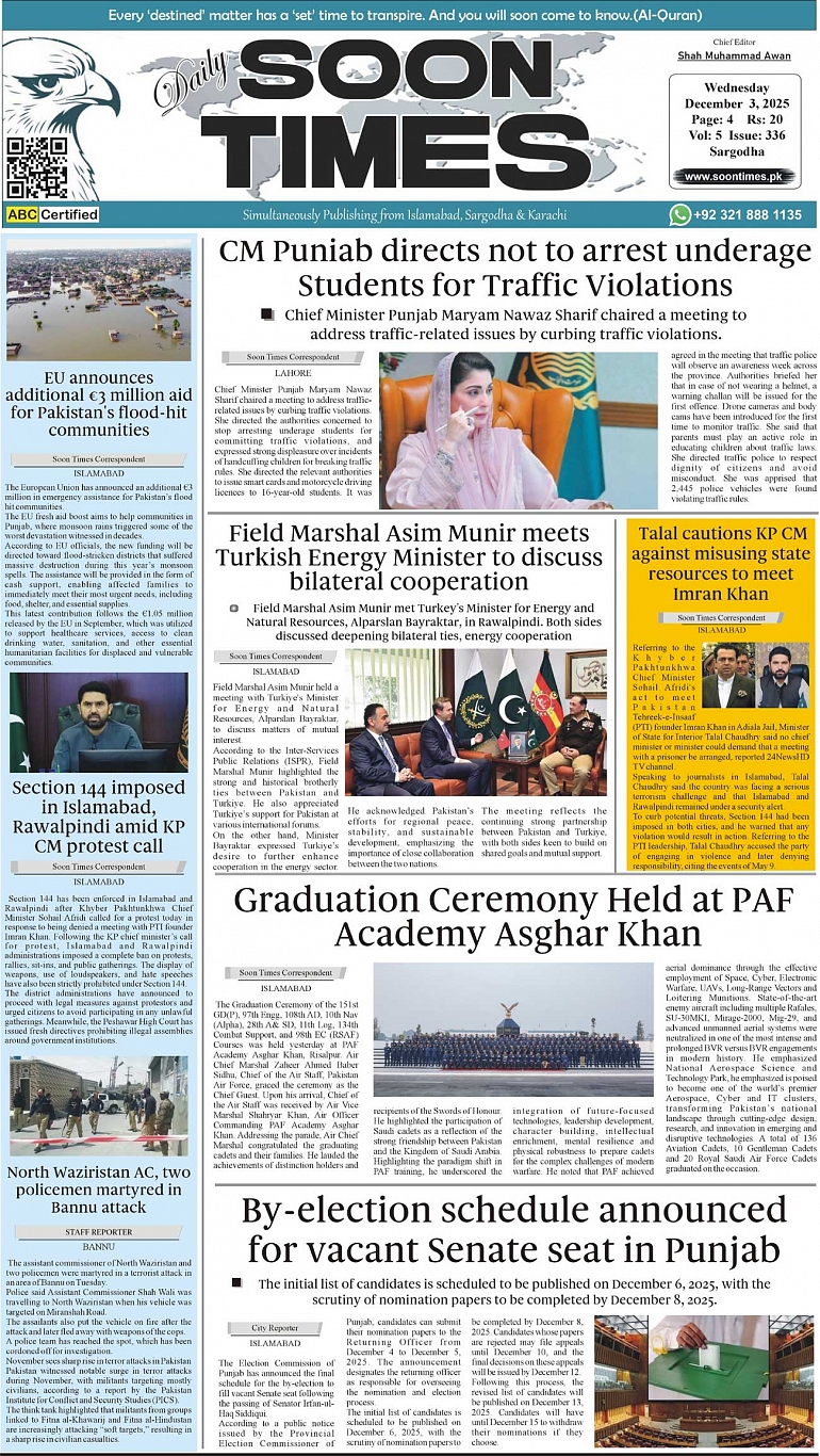 Daily Soon Times December 03, 2025 Daily Soon Times today's ePaper leading English national newspaper from Islamabad, Sargodha, Karachi, Pakistan << First << 1 >> Last >> Page 1Page 2Page 3Page 4 × Daily Soon Times 1234 1234 1