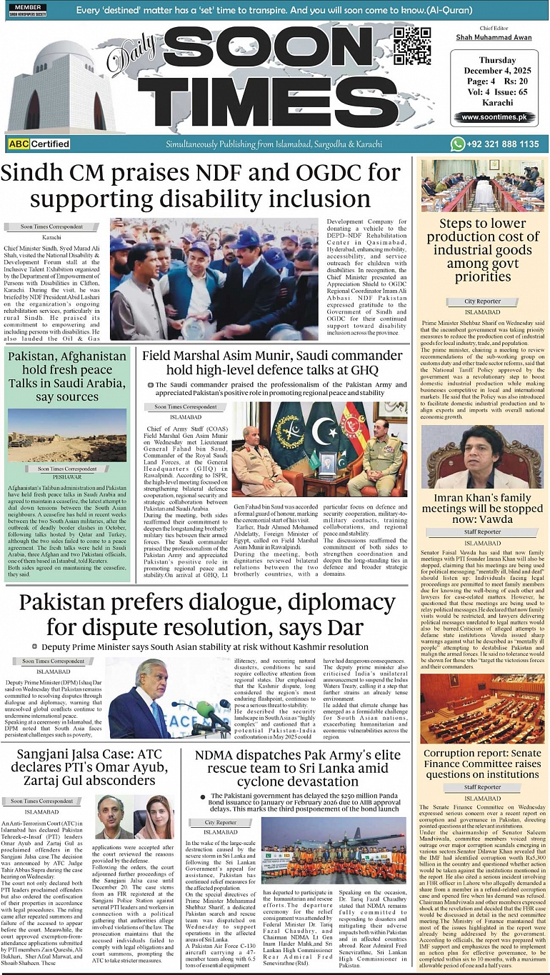 Daily Soon Times December 04, 2025 Daily Soon Times today's ePaper leading English national newspaper from Islamabad, Sargodha, Karachi, Pakistan << First << 1 >> Last >> Page 1Page 2Page 3Page 4 × Daily Soon Times 1k23k4 1k23k4 1k