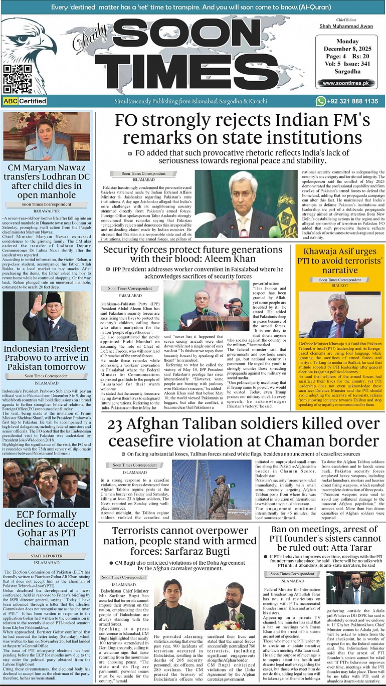Daily Soon Times today's ePaper leading English national newspaper from Islamabad, Sargodha, Karachi, Pakistan