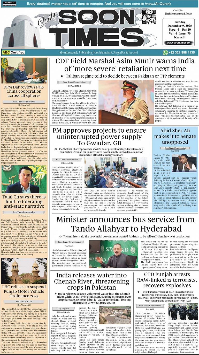 Daily Soon Times December 09, 2025 Daily Soon Times today's ePaper leading English national newspaper from Islamabad, Sargodha, Karachi, Pakistan << First << 1 >> Last >> Page 1Page 2Page 3Page 4 × Daily Soon Times 1k23k4k 1k23k4k 1k