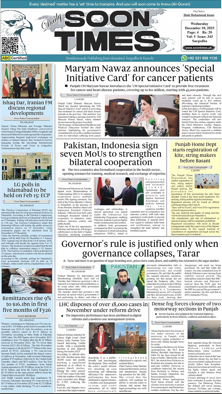Daily Soon Times today's ePaper leading English national newspaper from Islamabad, Sargodha, Karachi, Pakistan