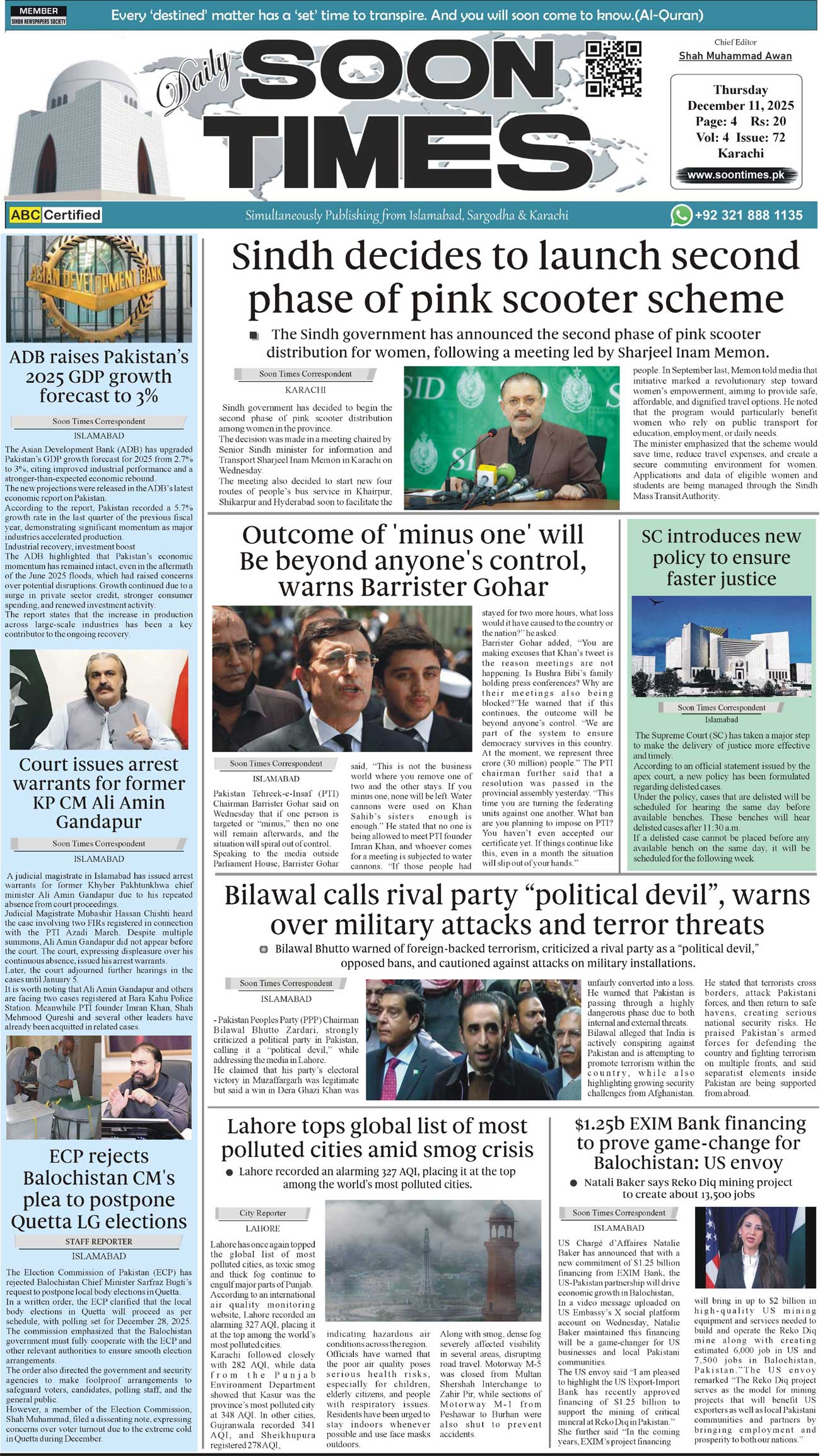 Daily Soon Times today's ePaper leading English national newspaper from Islamabad, Sargodha, Karachi, Pakistan