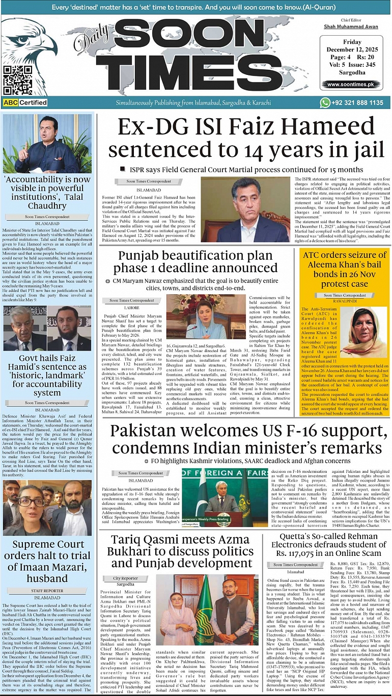 Daily Soon Times December 12, 2025 Daily Soon Times today's ePaper leading English national newspaper from Islamabad, Sargodha, Karachi, Pakistan << First << 1 >> Last >> Page 1Page 2Page 3Page 4 × Daily Soon Times 1234 1234 1