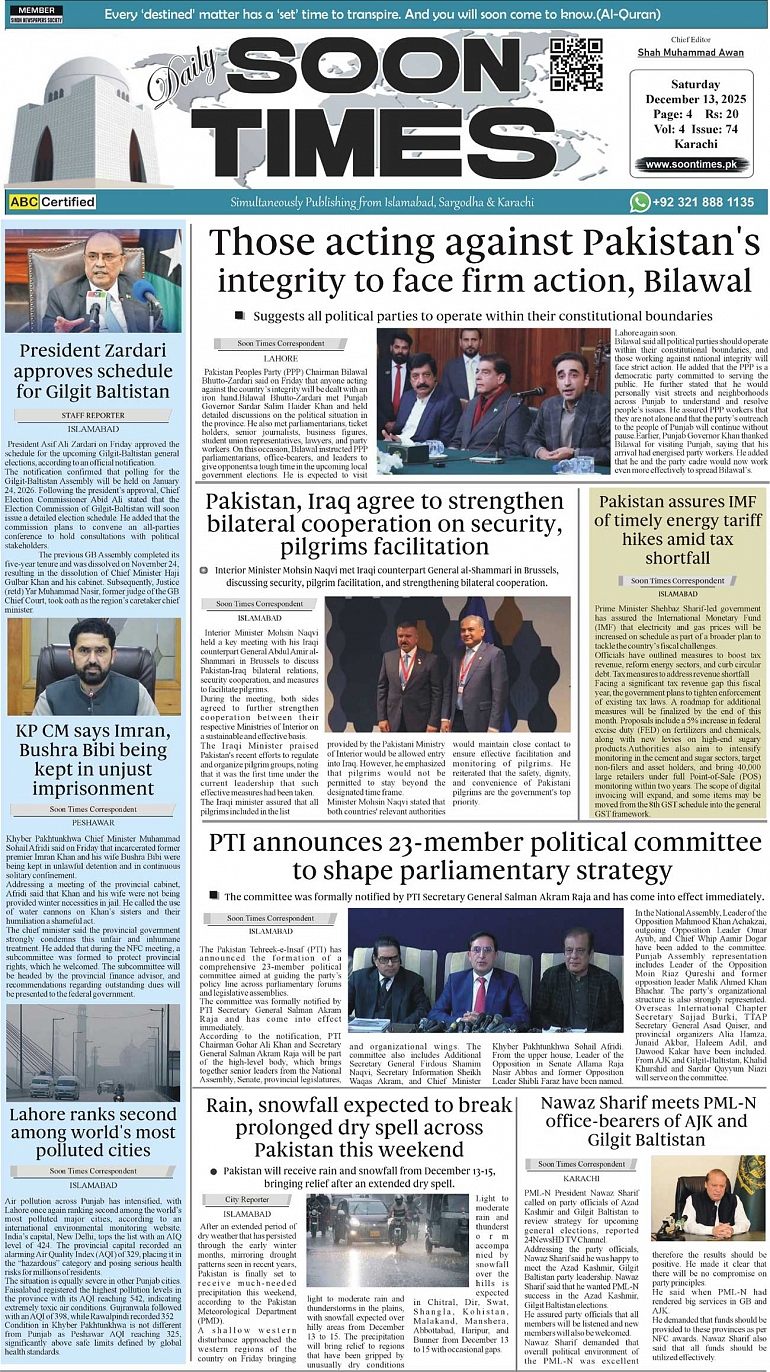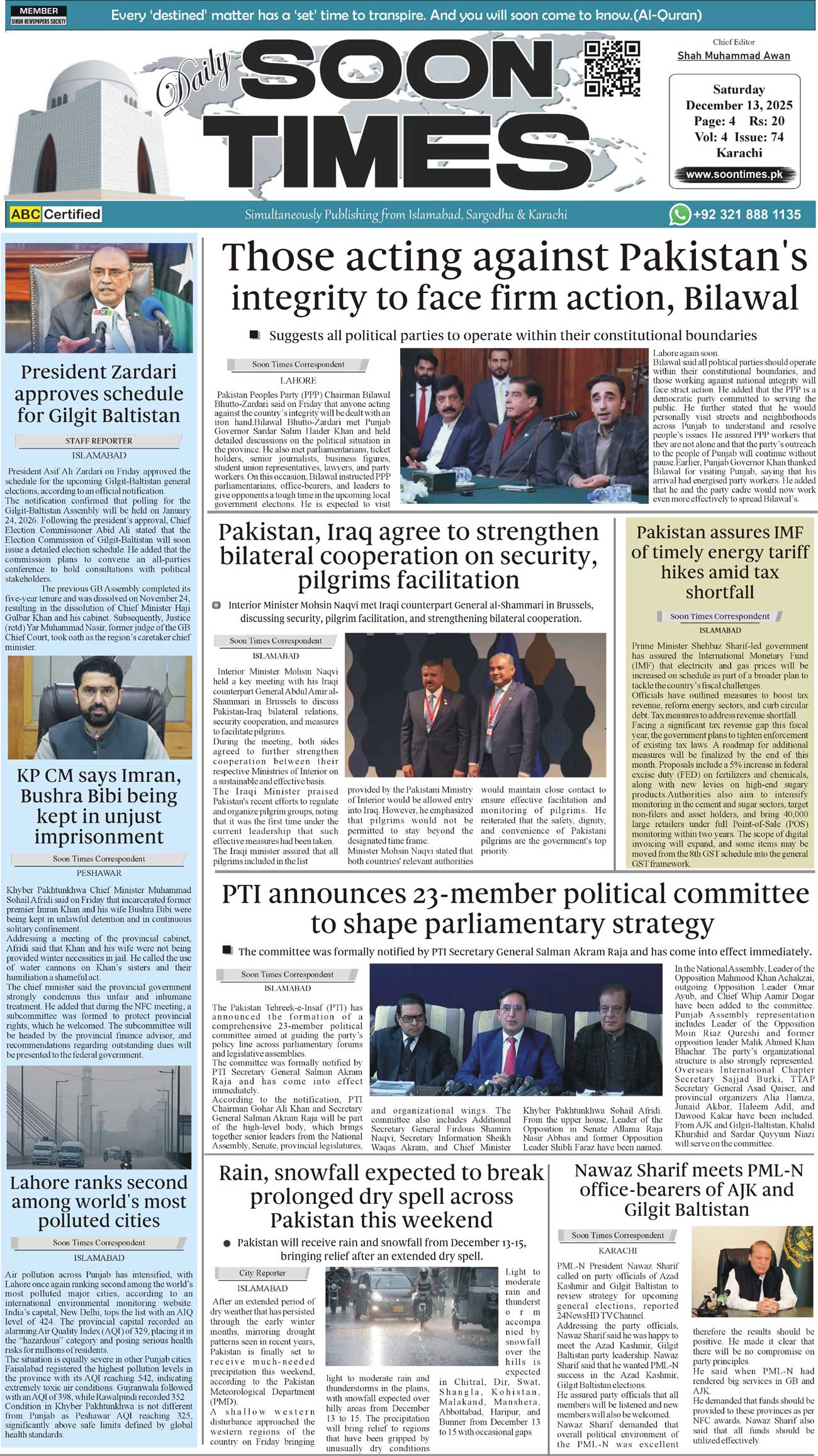 Daily Soon Times December 13, 2025 Daily Soon Times today's ePaper leading English national newspaper from Islamabad, Sargodha, Karachi, Pakistan << First << 1 >> Last >> Page 1Page 2Page 3Page 4 × Daily Soon Times 1k23k4 1k23k4 1k