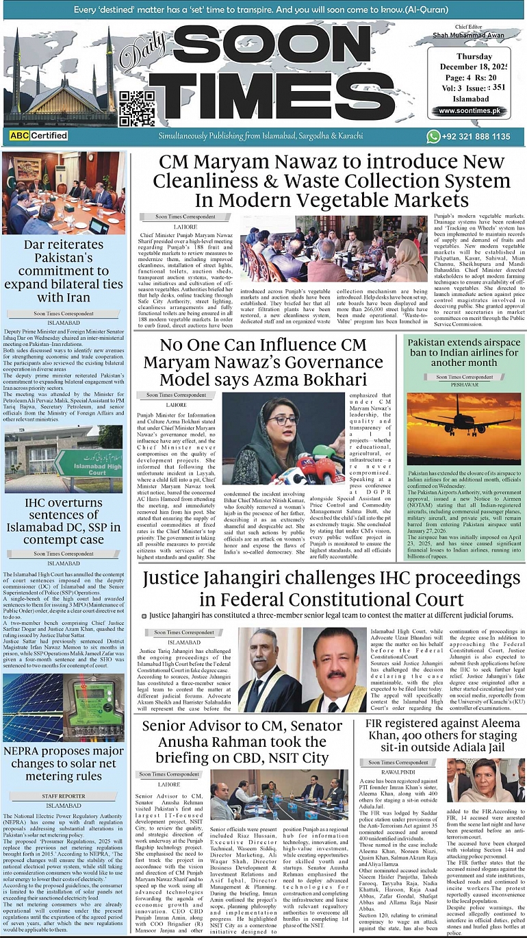 Daily Soon Times December 18, 2025 Daily Soon Times today's ePaper leading English national newspaper from Islamabad, Sargodha, Karachi, Pakistan << First << 1 >> Last >> Page 1Page 2Page 3Page 4 × Daily Soon Times 1.234k 1.234k 1.
