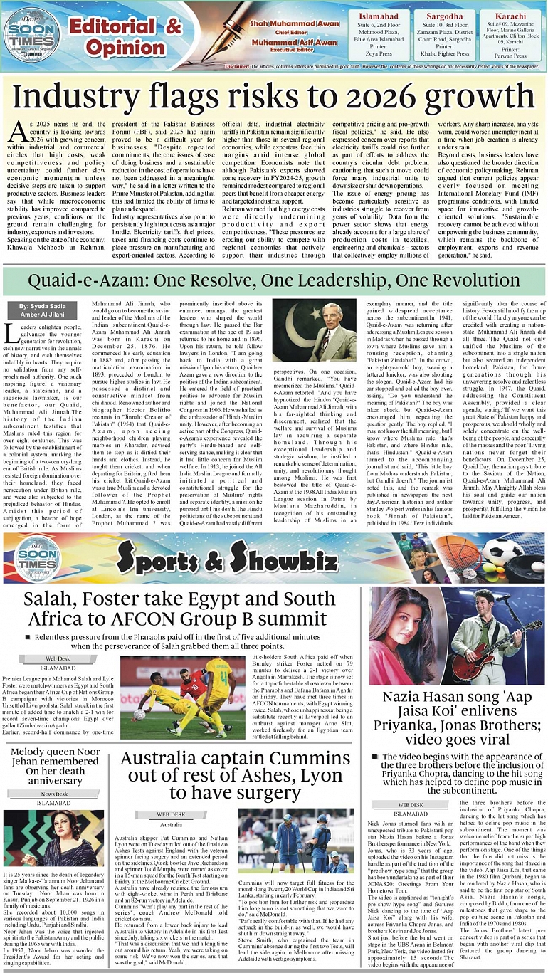 Daily Soon Times Page: 2 December 24, 2025 Daily Soon Times today's ePaper leading English national newspaper from Islamabad, Sargodha, Karachi, Pakistan << First << 2 >> Last >> Page 1Page 2Page 3Page 4 × Daily Soon Times 1234 1234 2