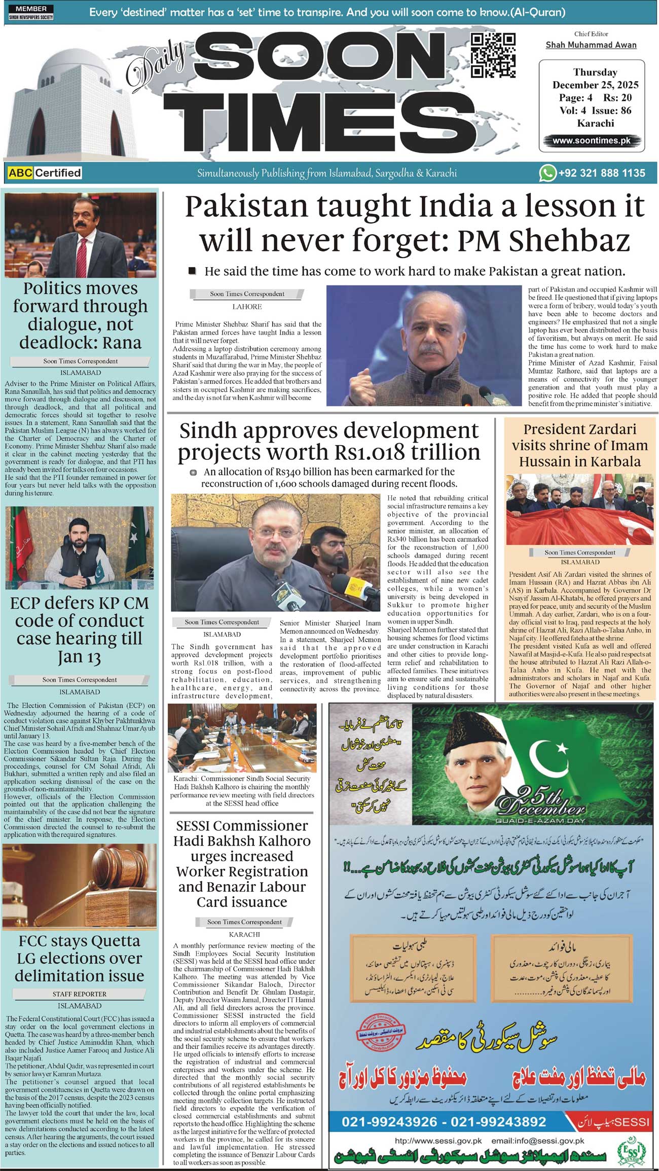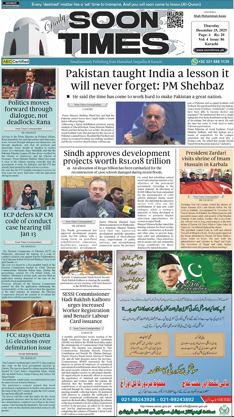 Daily Soon Times December 25, 2025 Daily Soon Times today's ePaper leading English national newspaper from Islamabad, Sargodha, Karachi, Pakistan << First << 1 >> Last >> Page 1Page 2Page 3Page 4 × Daily Soon Times 1k2k3k4a 1k2k3k4a 1k