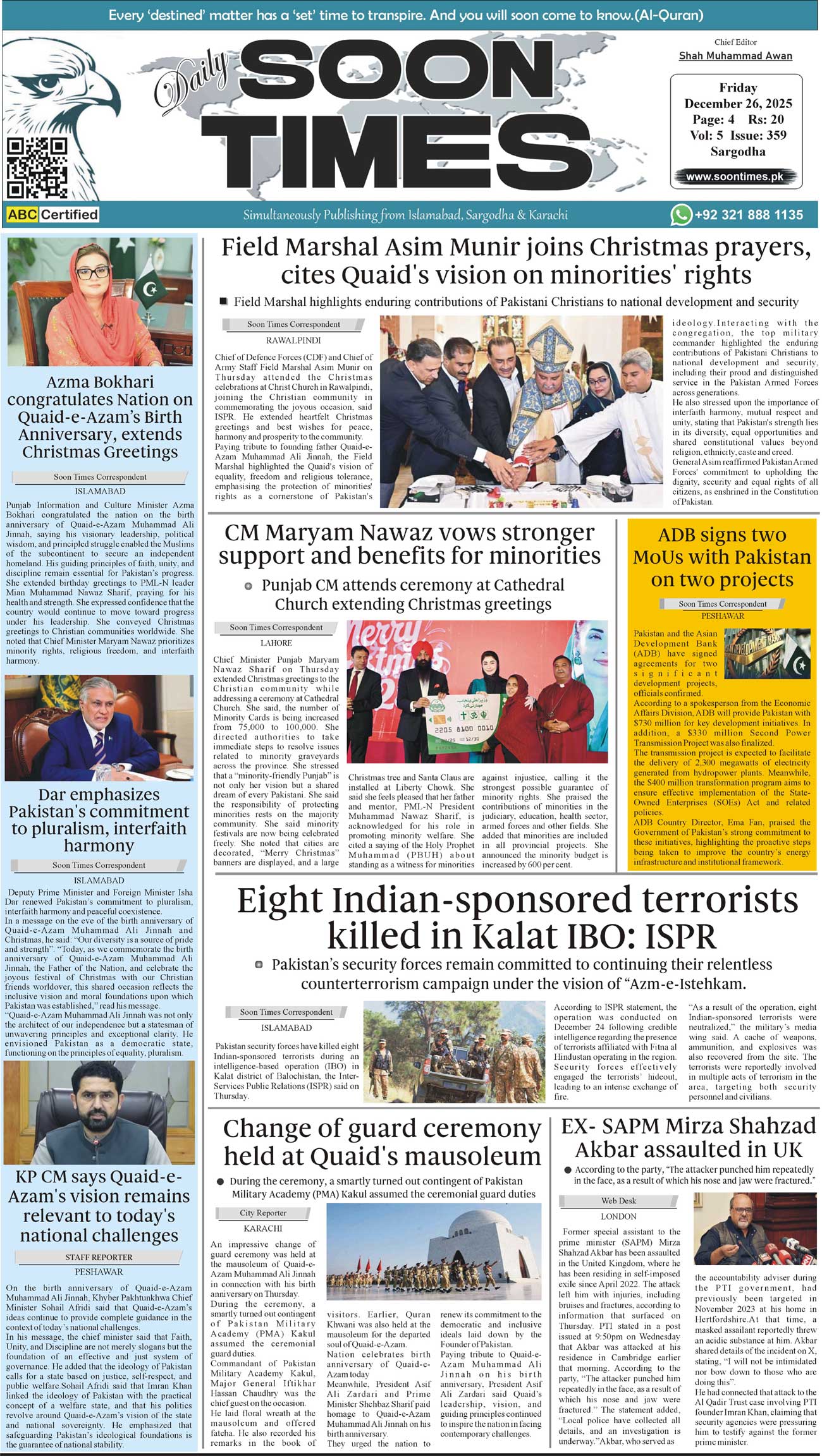 Daily Soon Times December 26, 2025 Daily Soon Times today's ePaper leading English national newspaper from Islamabad, Sargodha, Karachi, Pakistan << First << 1 >> Last >> Page 1Page 2Page 3Page 4 × Daily Soon Times 1234 1234 1