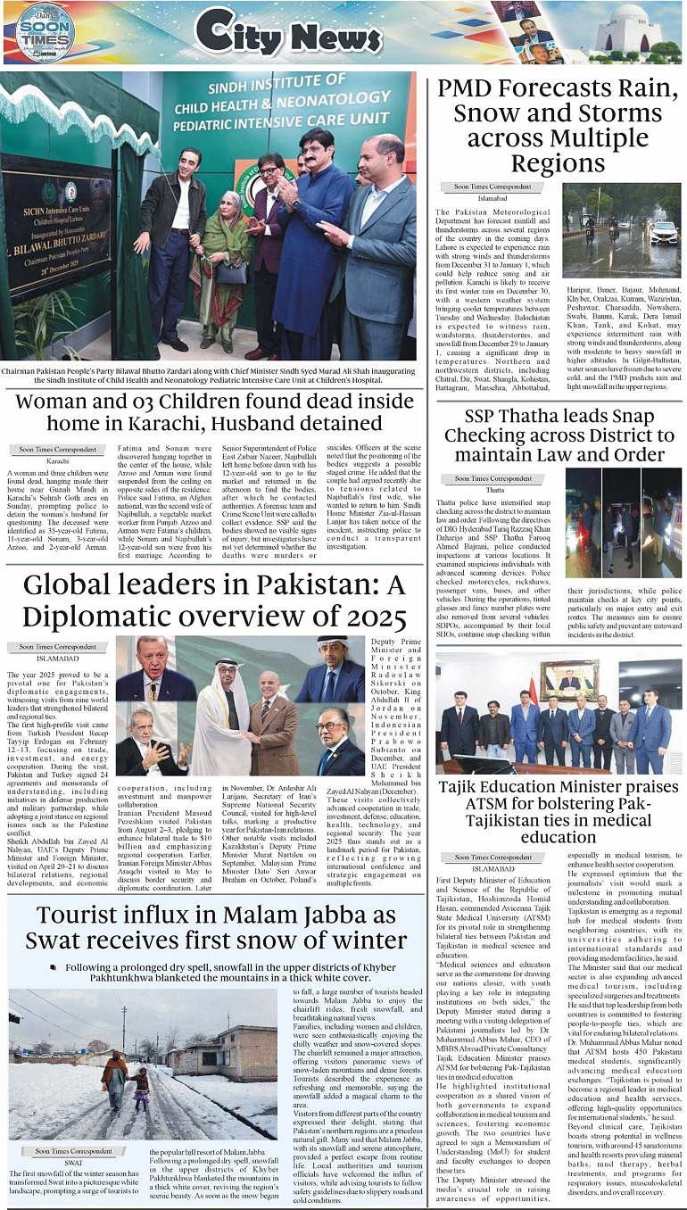 Daily Soon Times Page: 3 December 29, 2025 Daily Soon Times today's ePaper leading English national newspaper from Islamabad, Sargodha, Karachi, Pakistan << First << 3 >> Last >> Page 1Page 2Page 3Page 4 × Daily Soon Times 1k23k4 1k23k4 3k