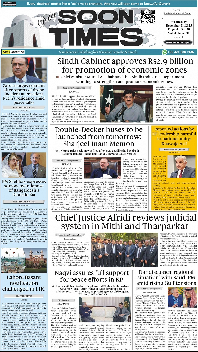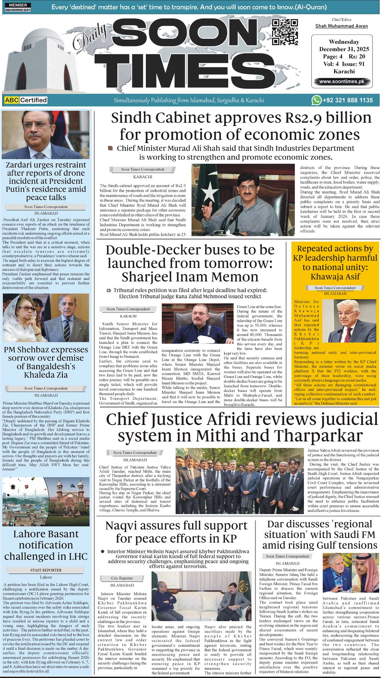 Daily Soon Times December 31, 2025 Daily Soon Times today's ePaper leading English national newspaper from Islamabad, Sargodha, Karachi, Pakistan << First << 1 >> Last >> Page 1Page 2Page 3Page 4 × Daily Soon Times 1k23k4 1k23k4 1k